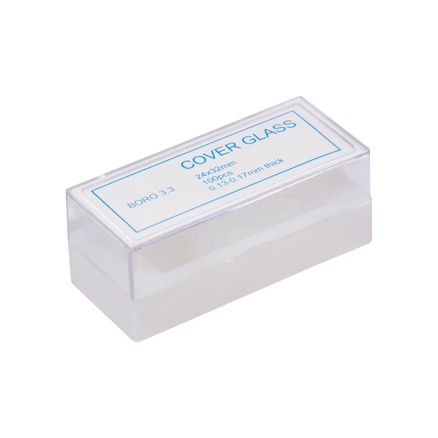 Rectangular Coverslip Cover Glasses measure 24x32mm with a thickness of #1 (0.13-0.17mm). Manufactured from clear, pure white borosilicate glass for excellent clarity, flatness, and chemical resistance. They conform with ISO 8255 standard for dimensional tolerances, thickness and optical properties, and are free of flaws and blisters. Pack of 100 coverslips comes in a plastic storage box with hinged lid for protection.