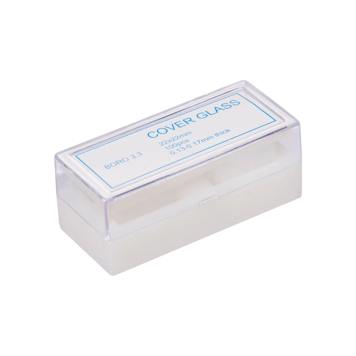 Square Coverslip Cover Glasses measure 22x22mm with a thickness of #1 (0.13-0.17mm). Manufactured from clear, pure white borosilicate glass for excellent clarity, flatness, and chemical resistance. They conform with ISO 8255 standard for dimensional tolerances, thickness and optical properties, and are free of flaws and blisters. Pack of 100 coverslips comes in a plastic storage box with hinged lid for protection.