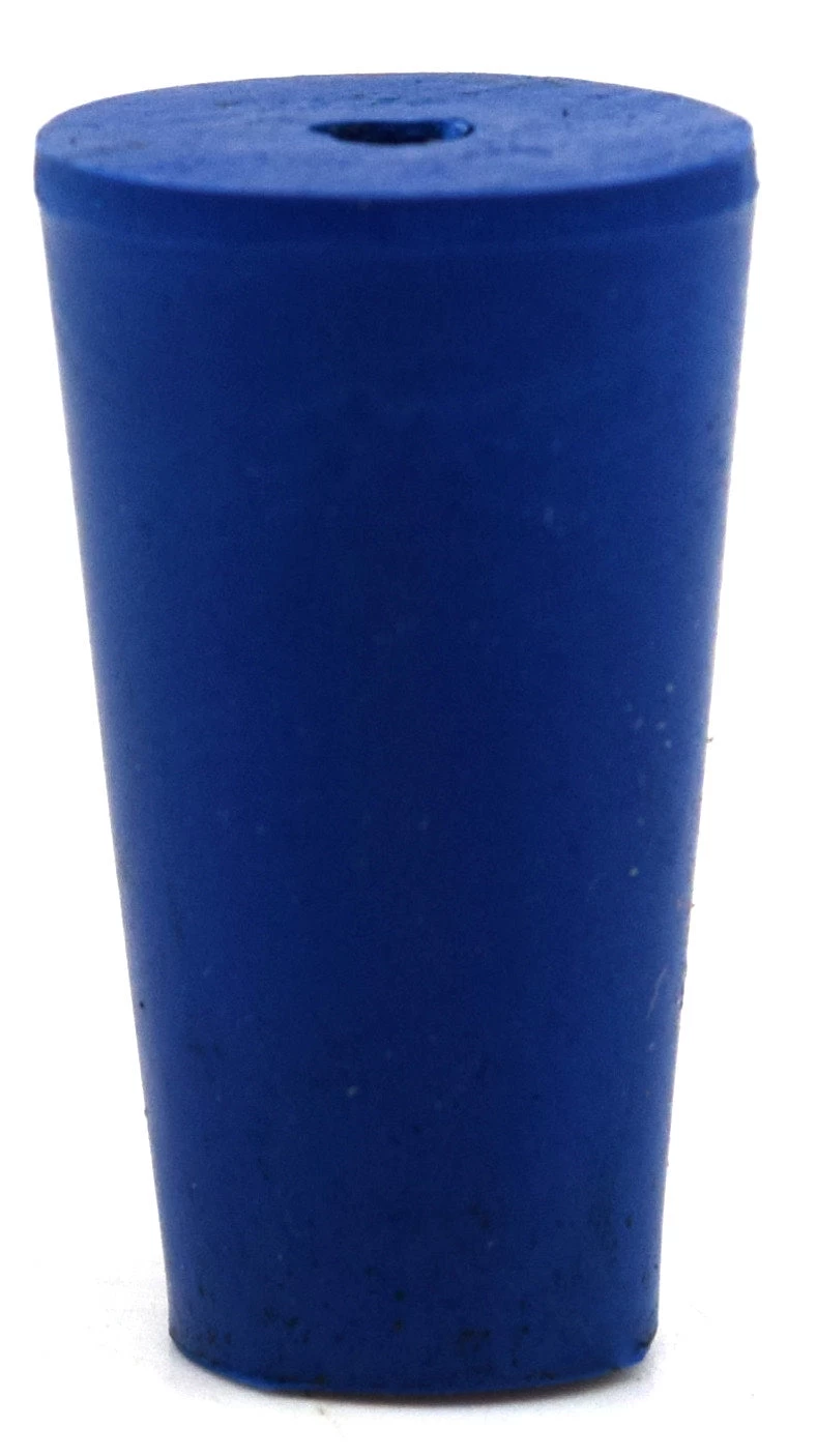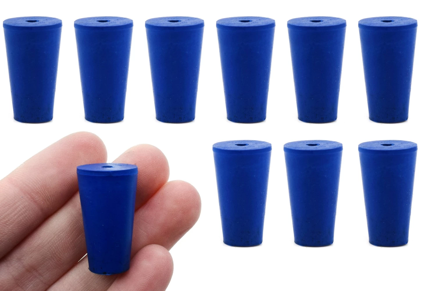 Pack of ten #0 stoppers made of long lasting neoprene rubber. Blue color. Each stopper features one hole measuring 5mm in diameter. Manufactured according to sizes recommended by ASTM standards. Each stopper measures 25mm in length, has a base diameter measuring 13mm, and a top diameter measuring 17mm. The neoprene rubber construction is suitable for use with petroleum products, minerals, oils and fats, as well as most inorganic acids and bases. Resistant to temperatures ranging from -40 to 130°C.