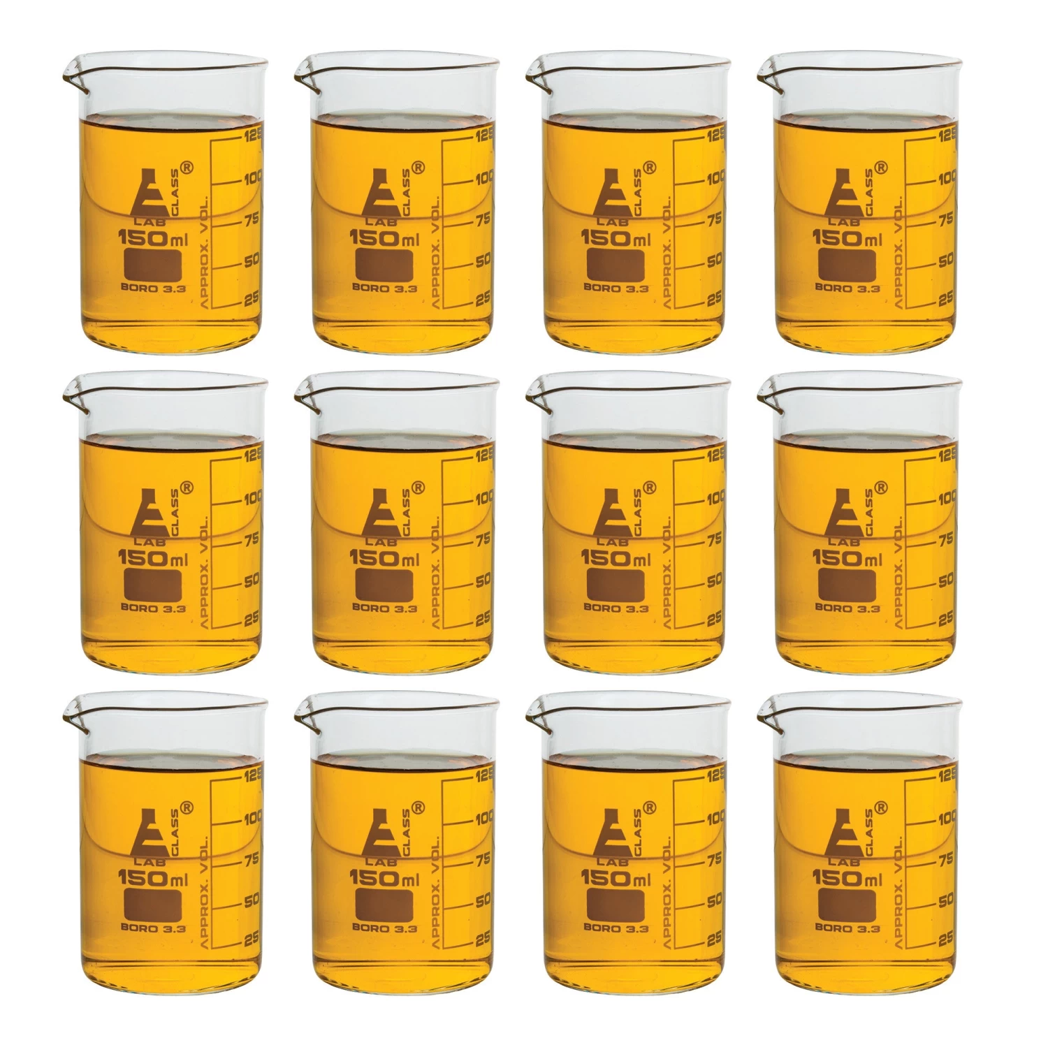 Pack of 12, 150ml capacity, low form Griffin beakers made of Borosilicate 3.3 Glass. Each beaker features white graduation lines, marked every 25ml, as per DIN 12231. Spout for easy pouring. Uniform walls provide excellent strength against breakage.