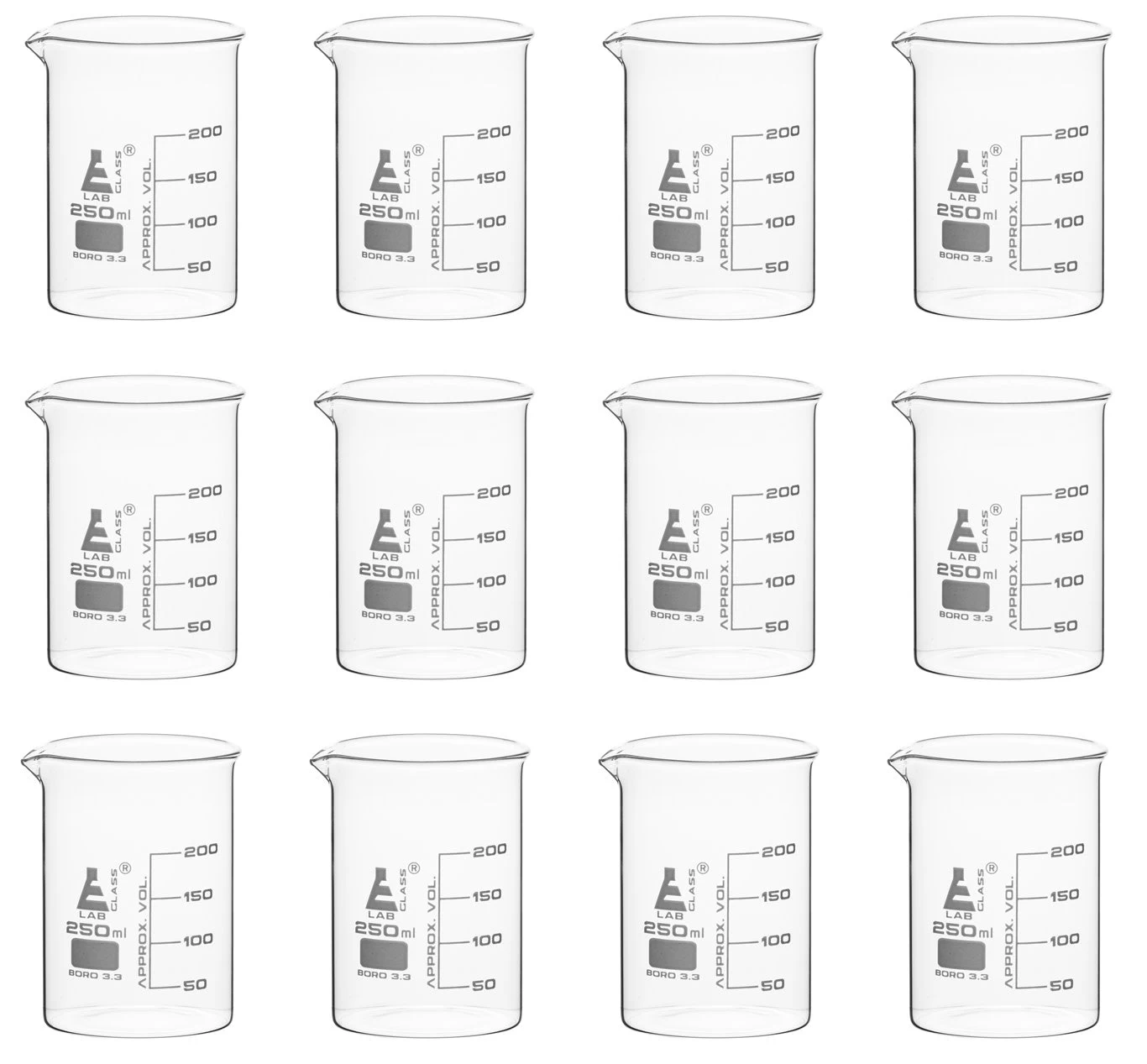 Pack of 12 low form beakers made of Borosilicate 3.3 Glass. 250ml capacity. Each beaker features white graduations every 50ml, as per DIN 12231. Spout for easy pouring. Uniform walls provide excellent strength against breakage.