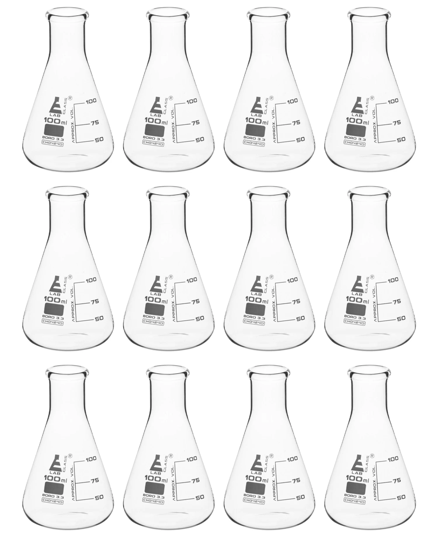 Pack of 12 100mL Erlenmeyer Flasks with narrow necks are made of heavy-duty borosilicate 3.3 glass. Features white enamal graduations every 25mL, a uniform wall thickness ideal for heating, and a reinforced rim to protect against accidental impacts. Meets DIN ISO 1773 standards for conical flasks.