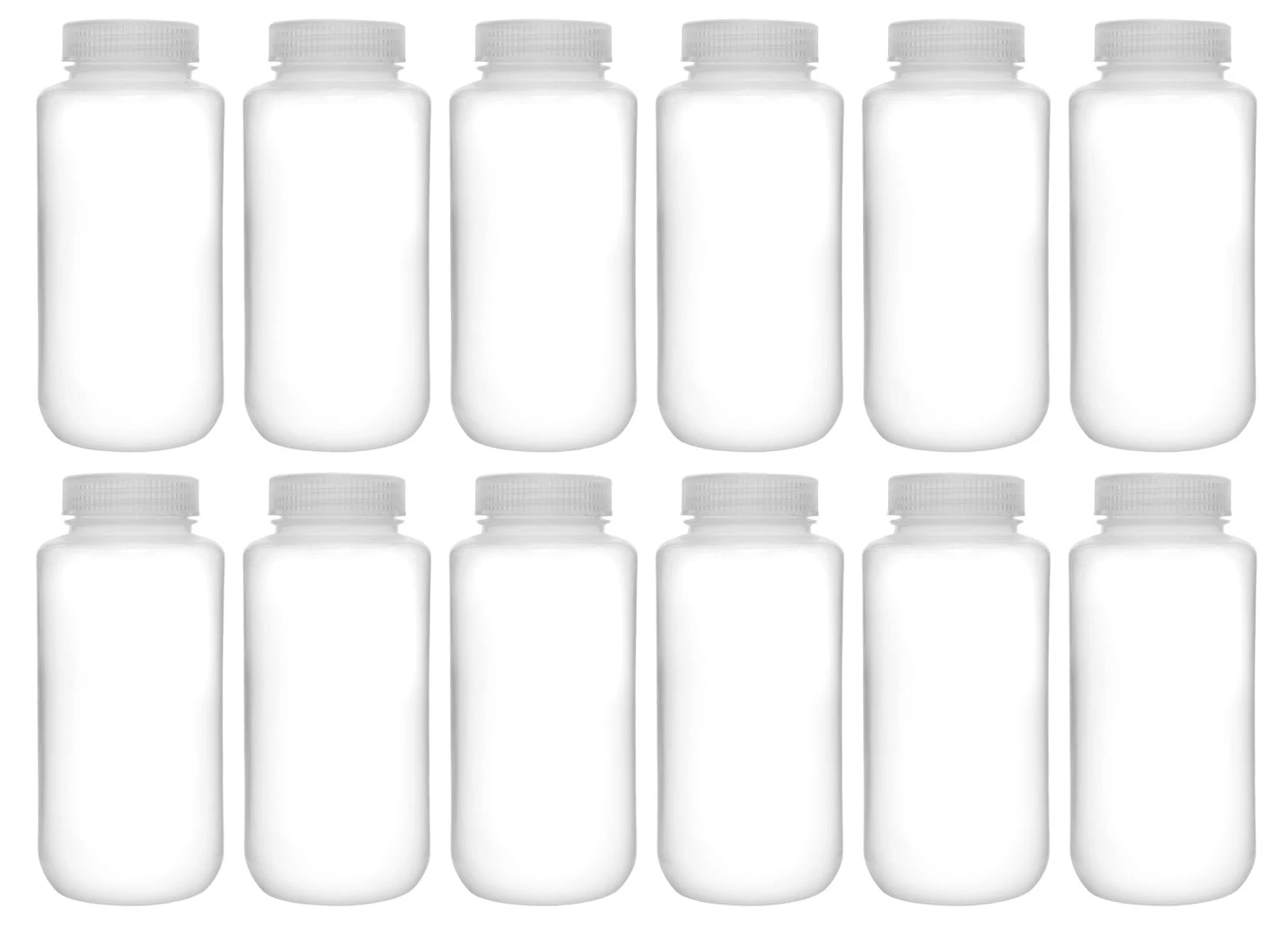 Pack of twelve 1000ml capacity, wide neck reagent bottles with leak-proof screw caps. Perfect for storing chemicals, liquids and powders. Both the bottle and screw cap are made of high quality, rigid polypropylene plastic that is translucent and provides excellent optical clarity.