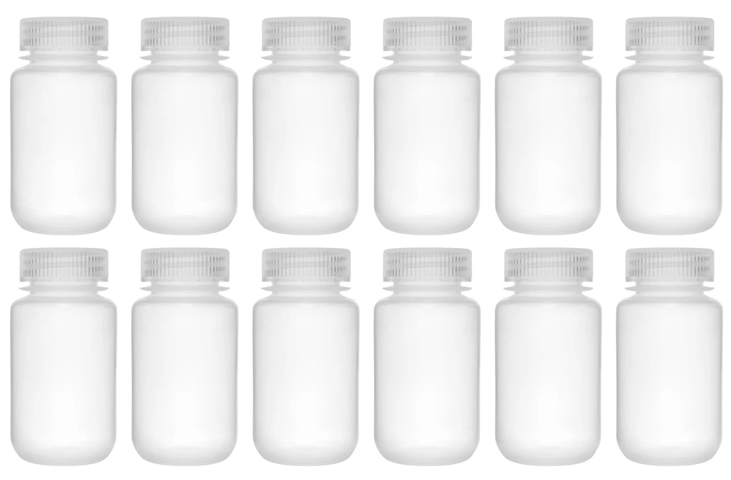 Pack of twelve 125ml capacity, wide neck reagent bottles with leak-proof screw caps. Perfect for storing chemicals, liquids and powders. Both the bottle and screw cap are made of high quality, rigid polypropylene plastic that is translucent and provides excellent optical clarity.