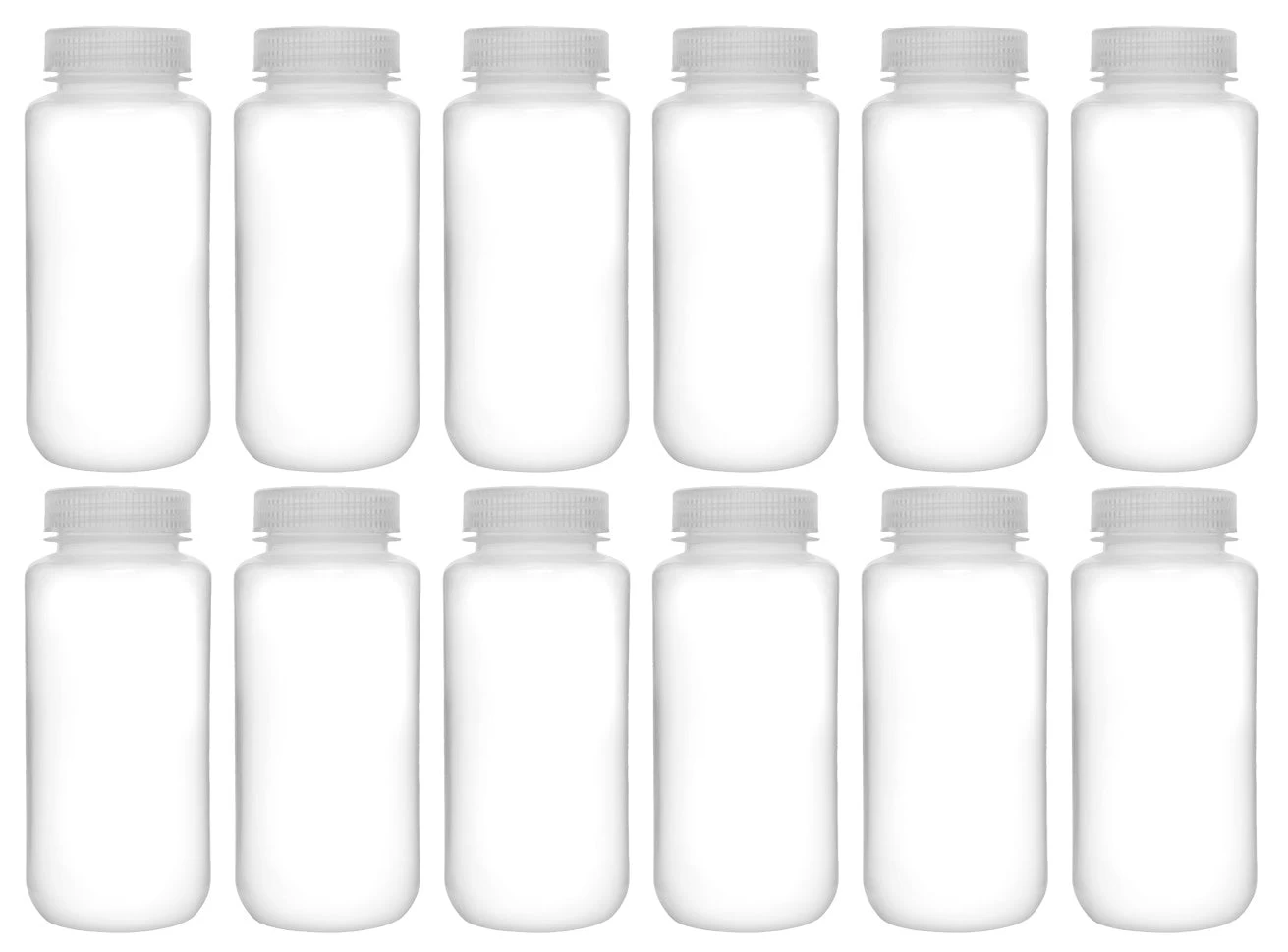 Pack of twelve 500ml capacity, wide neck reagent bottles with leak-proof screw caps. Perfect for storing chemicals, liquids and powders. Both the bottle and screw cap are made of high quality, rigid polypropylene plastic that is translucent and provides excellent optical clarity.