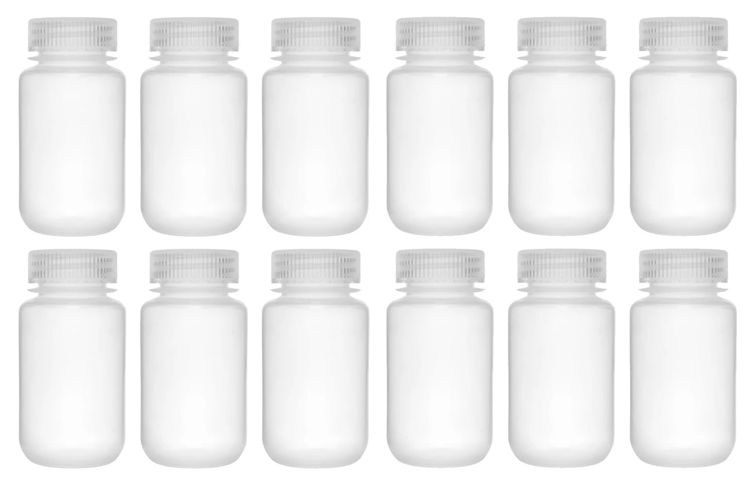 Pack of twelve 60ml capacity, wide neck reagent bottles with leak-proof screw caps. Perfect for storing chemicals, liquids and powders. Both the bottle and screw cap are made of high quality, rigid polypropylene plastic that is translucent and provides excellent optical clarity.
