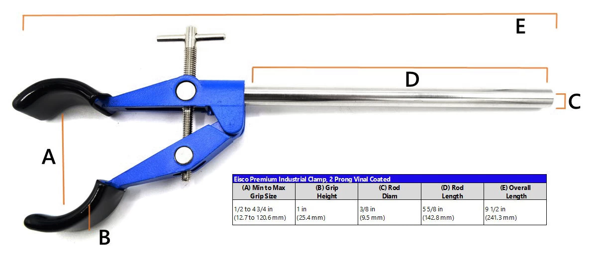 - 2 VINYL COATED PRONGS || Clamp accepts burettes, flasks & beakers measuring up to 11 cm (4.3″). Vinyl coated prongs provide a strong, slip-free hold. Thread fitted actuating joints