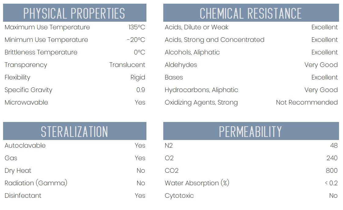 Microwavable and resistant to fatigue for long term durability. High heat tolerance with a temperature range of -180 to +145°C. Autoclavable at 121°C for easy cleaning and sterilization.