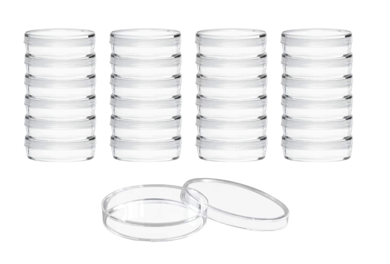 Pack of 25 disposable petri dishes made of high quality, transparent polystyrene plastic. Sterile. Triple vented lid to allow for airflow and discourage condensation build-up. Ideal for applications requiring better gaseous exchange or evaporation. Petri dish is packed individually in polyethylene bags and sterilized by radiation. Non-toxic, multifunctional and ready to use. Excellent for general laboratory applications, including cell culturing, plant germination, precipitate drying and solvent evaporation, home or classroom science experiments, crafting, small storage solutions and more.