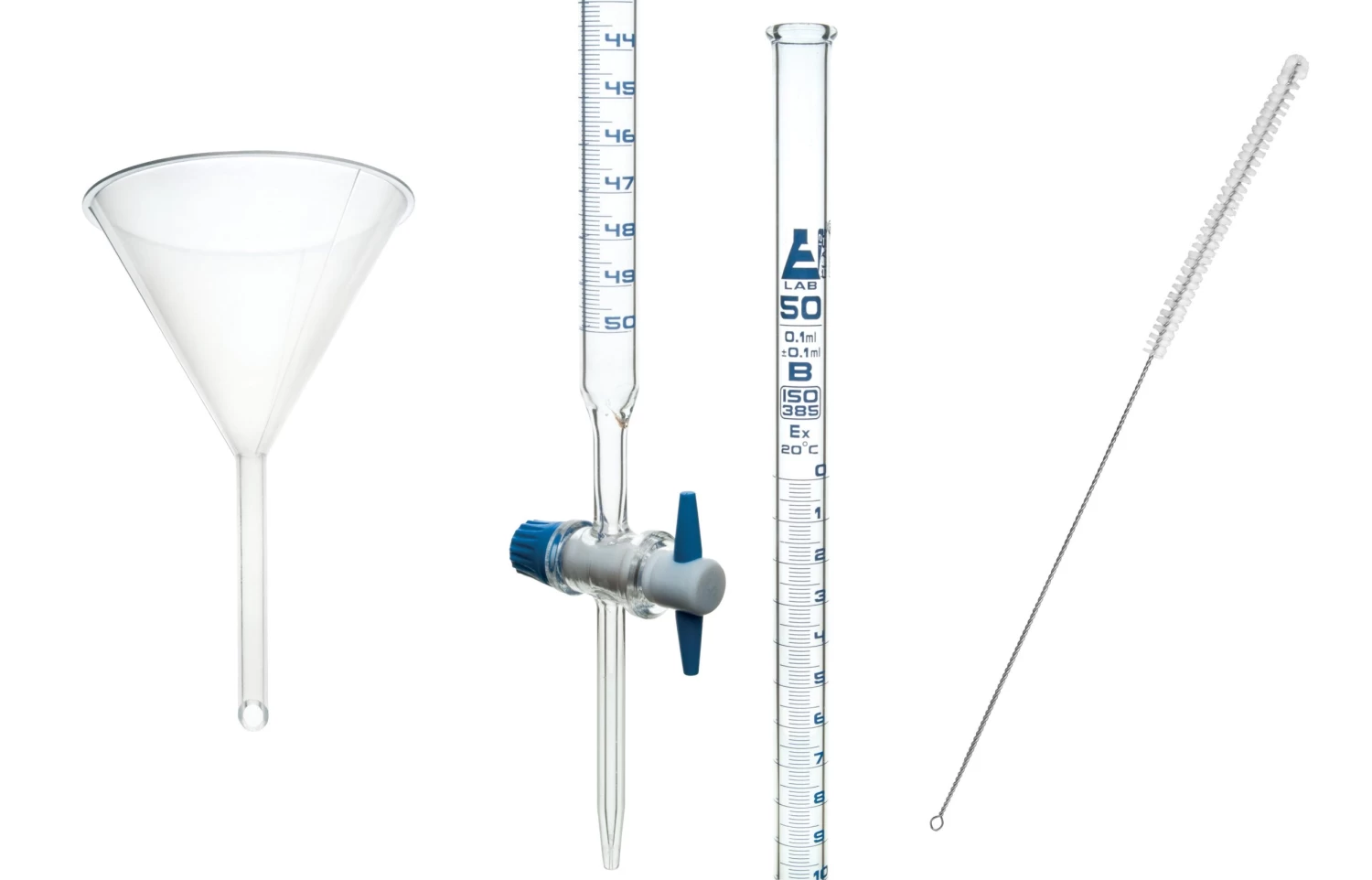 This convenient set contains an industrial-quality borosilicate glass burette, along with basic labware components typically required for its use:
