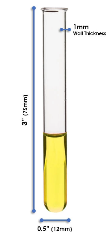 Each tube measures 2.5″ (75mm) tall, with an outer diameter of 0.5″ (12mm). Inner diameter measures 11mm. Accommodates stoppers with a bottom diameter of 9-10mm & top diameter of 13-15mm.