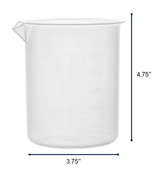 Beakers measure 4.8″ tall and 3.6″ in diameter. Inner diameter measures 3.5″. Microwavable, autoclavable, with superior chemical durability. Can withstand temperatures between -20°C to 135°C.