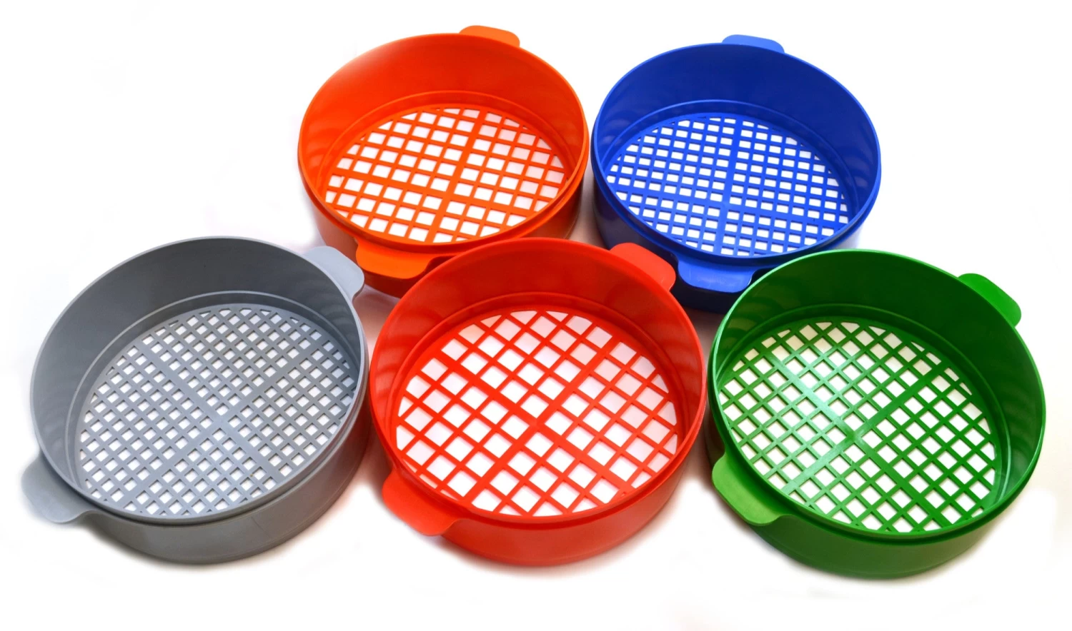 Pack of 5 stackable sifters used to separate materials. Each sifter measures 8″ in diameter. Each sieve has different sized holes which are useful when experimenting with varying particle sizes and materials. Holes measure 9/16″, 1/2″, 7/16″, 5/16″, and 1/4″.