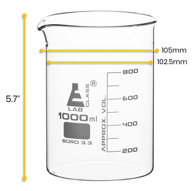 Pack of 6 low form beakers made of borosilicate 3.3 Glass. 1000mL capacity. Each beaker features white graduations every 100mL, as per DIN 12231. Spout for easy pouring. Uniform walls provide excellent strength against breakage.