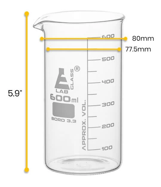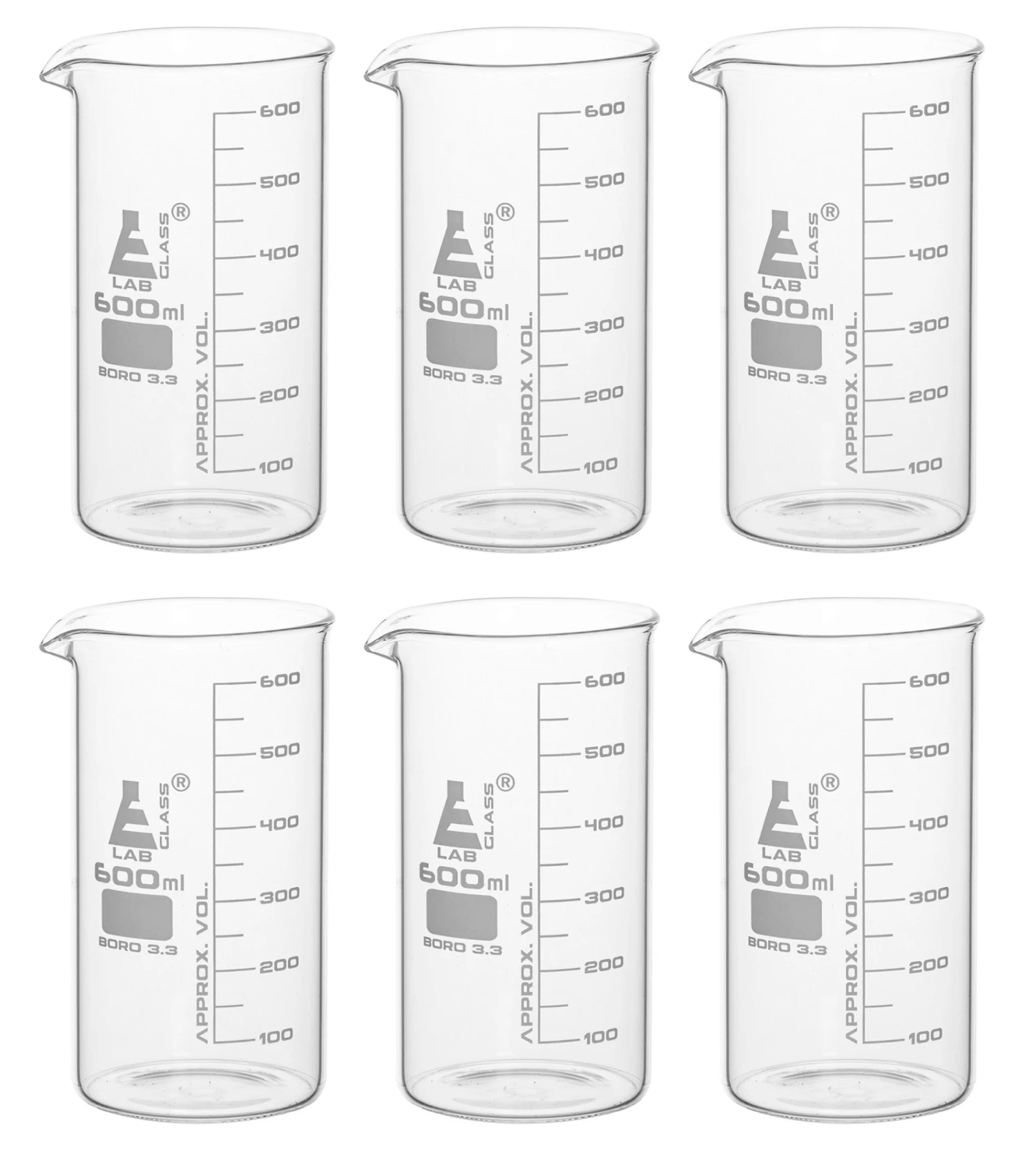 Pack of 6, 600ml capacity, tall form beakers made of Borosilicate 3.3 Glass. Spouts for easy pouring. Uniform walls provide excellent strength against breakage.