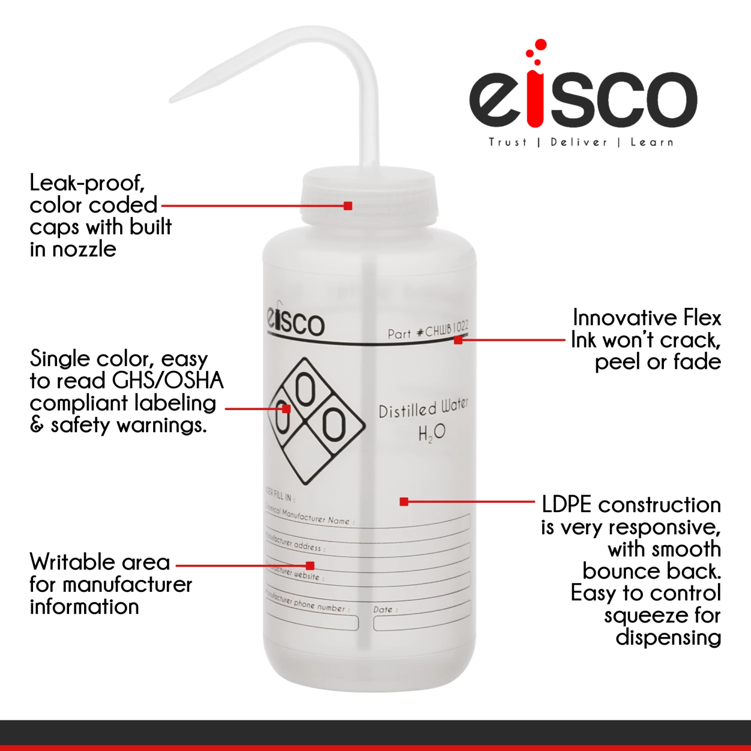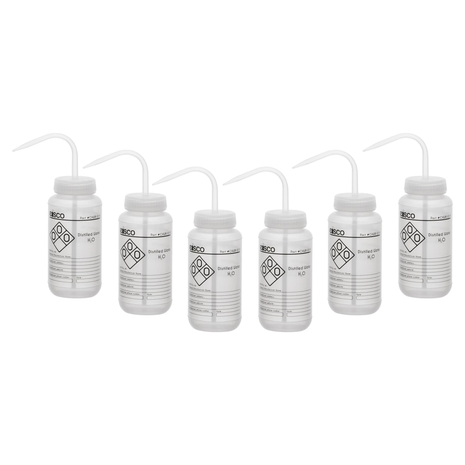 Pack of 6 wash bottles made with Eisco Labs exclusive Performance Plastic. Made of low density polyethylene (LDPE) for superior quality, strength. Innovative Flex Ink won’t fade, crack or peel.