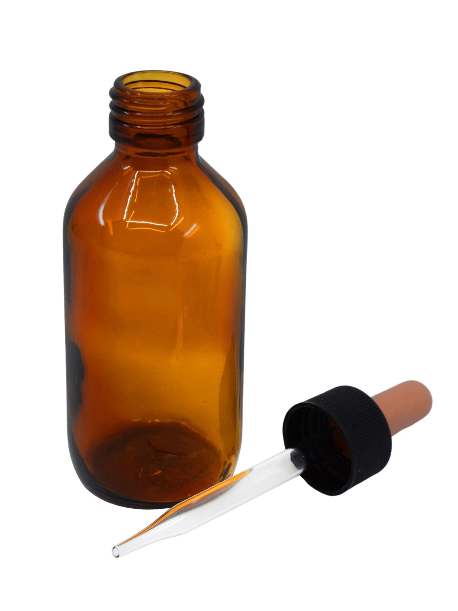 Pack of six, high quality dropping bottles made of amber colored soda glass. 100ml (3.3oz) capacity. Suitable for a variety of applications in the household, classroom or laboratory. Excellent for transferring and mixing essential oils, indicators, stains or other aqueous solutions. Bottle includes a screw top cap with built in glass pipette dropper and rubber bulb. Bottle (with screw cap) measures 5.7″ tall and 1.9″ in diameter.