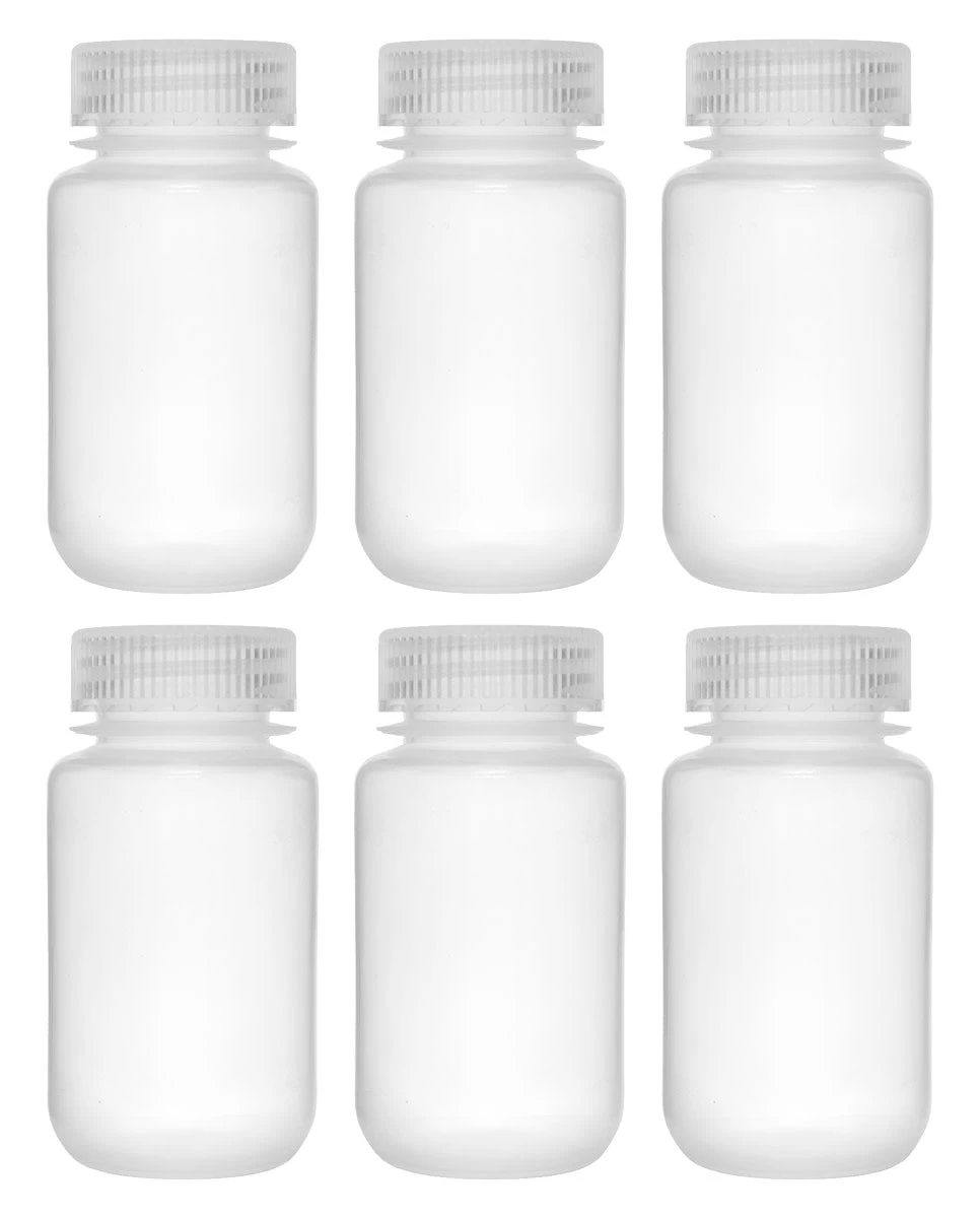 Pack of six 125ml capacity, wide neck reagent bottles with leak-proof screw caps. Perfect for storing chemicals, liquids and powders. Both the bottle and screw cap are made of high quality, rigid polypropylene plastic that is translucent and provides excellent optical clarity.