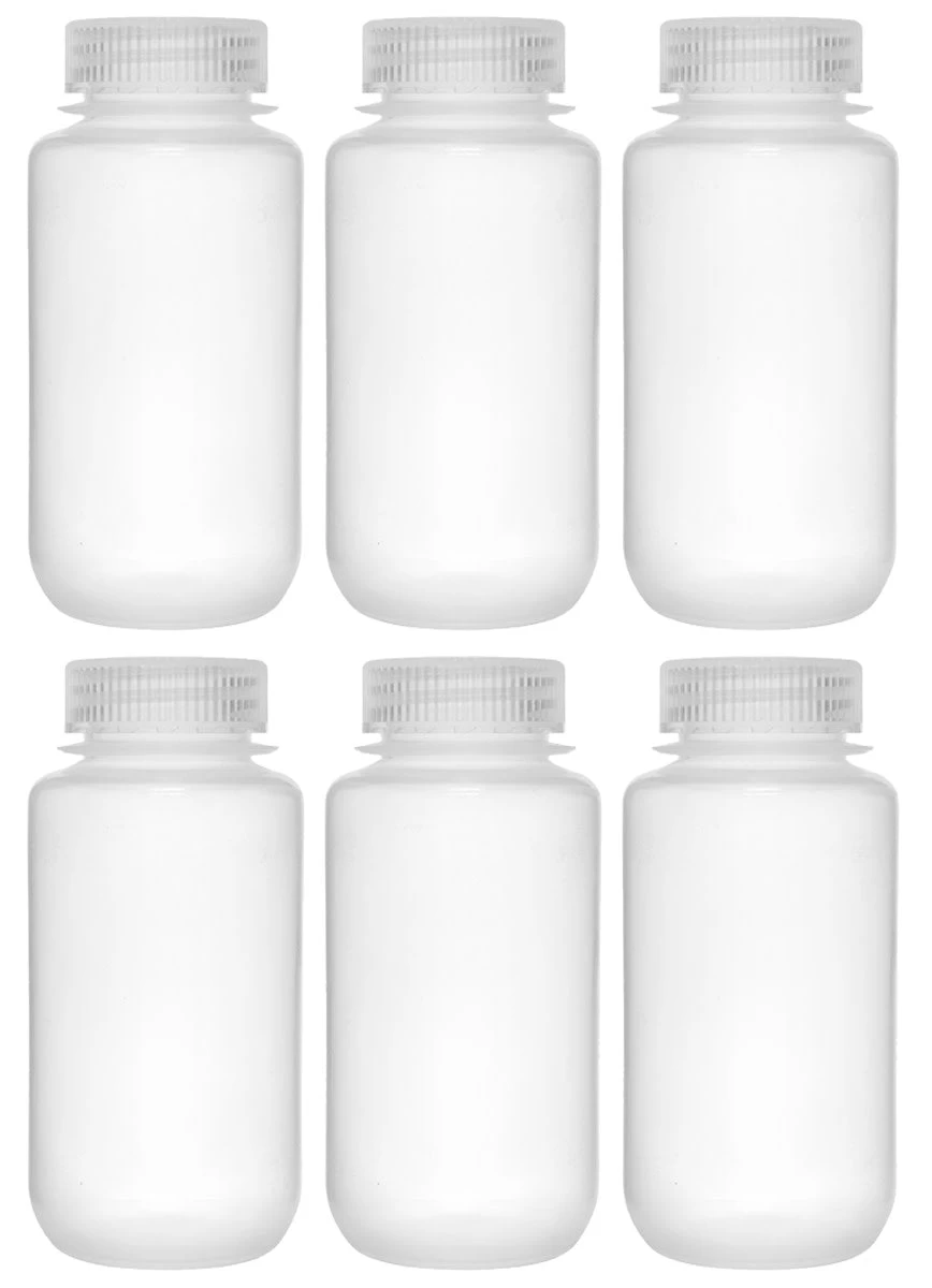 Pack of six 250ml capacity, wide neck reagent bottles with leak-proof screw caps. Perfect for storing chemicals, liquids and powders. Both the bottle and screw cap are made of high quality, rigid polypropylene plastic that is translucent and provides excellent optical clarity.