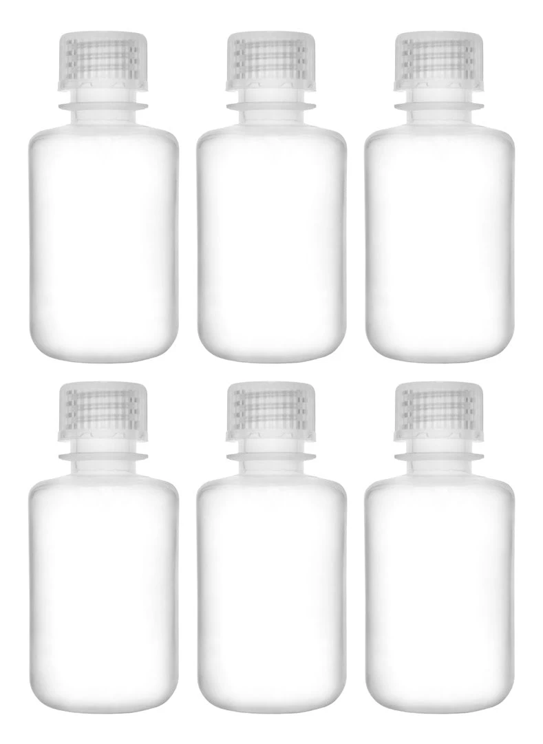Pack of six 60ml capacity, narrow neck reagent bottles with leak-proof screw caps. Perfect for storing chemicals, liquids and powders. Both the bottle and screw cap are made of high quality, rigid polypropylene plastic that is translucent and provides excellent optical clarity.