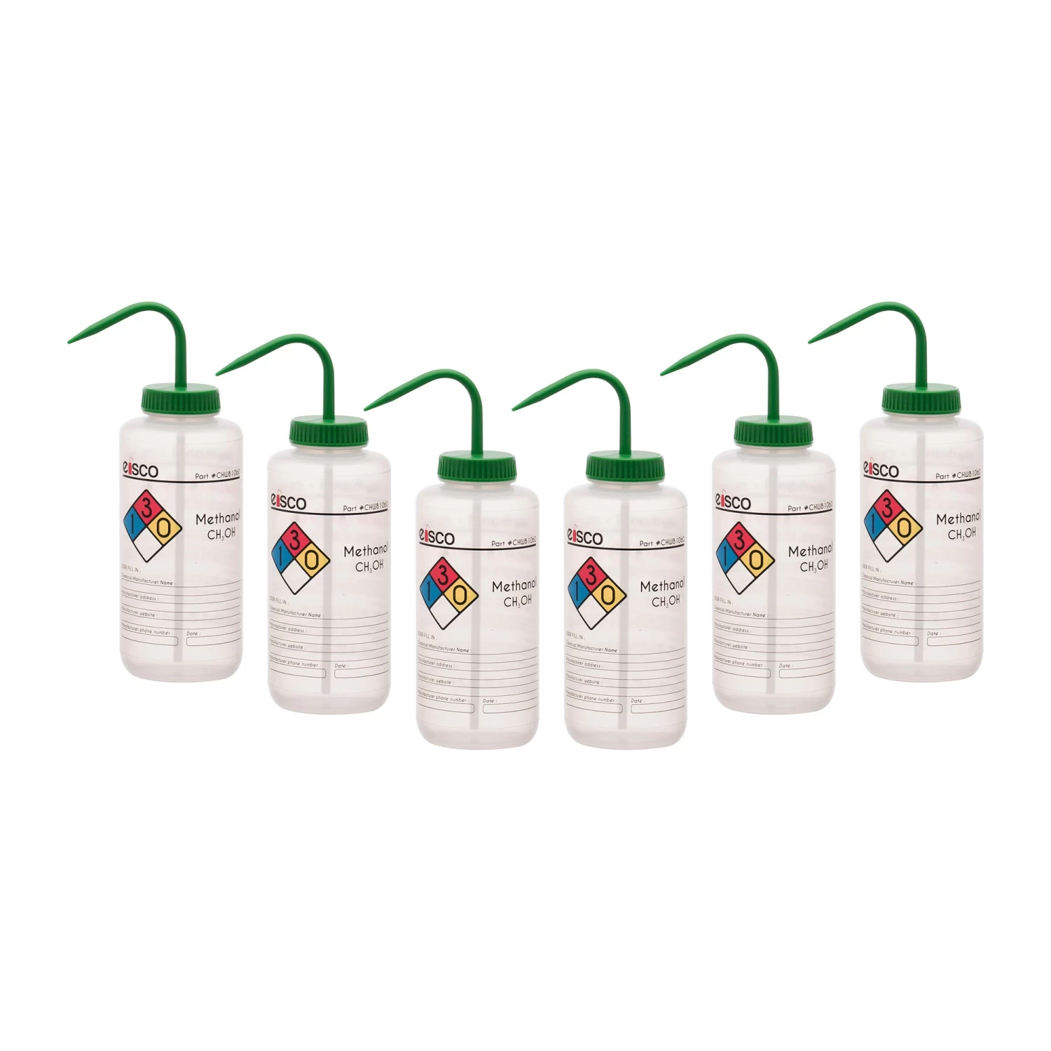 Pack of six chemical wash bottles made with Eisco Labs exclusive Performance Plastic. Made of low density polyethylene (LDPE) for superior quality, strength. Innovative Flex Ink won’t fade, crack or peel.