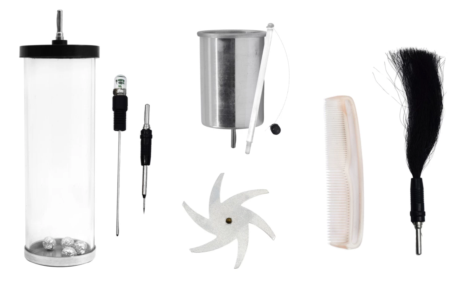 - INCLUDES 7 COMPONENTS || Set includes pillar with suspended metallized sphere & Faraday’s pail, Perspex cylinder with metal caps and 4 metallized spheres, head of hair, comb, point discharger, neon bulb and electric whirl