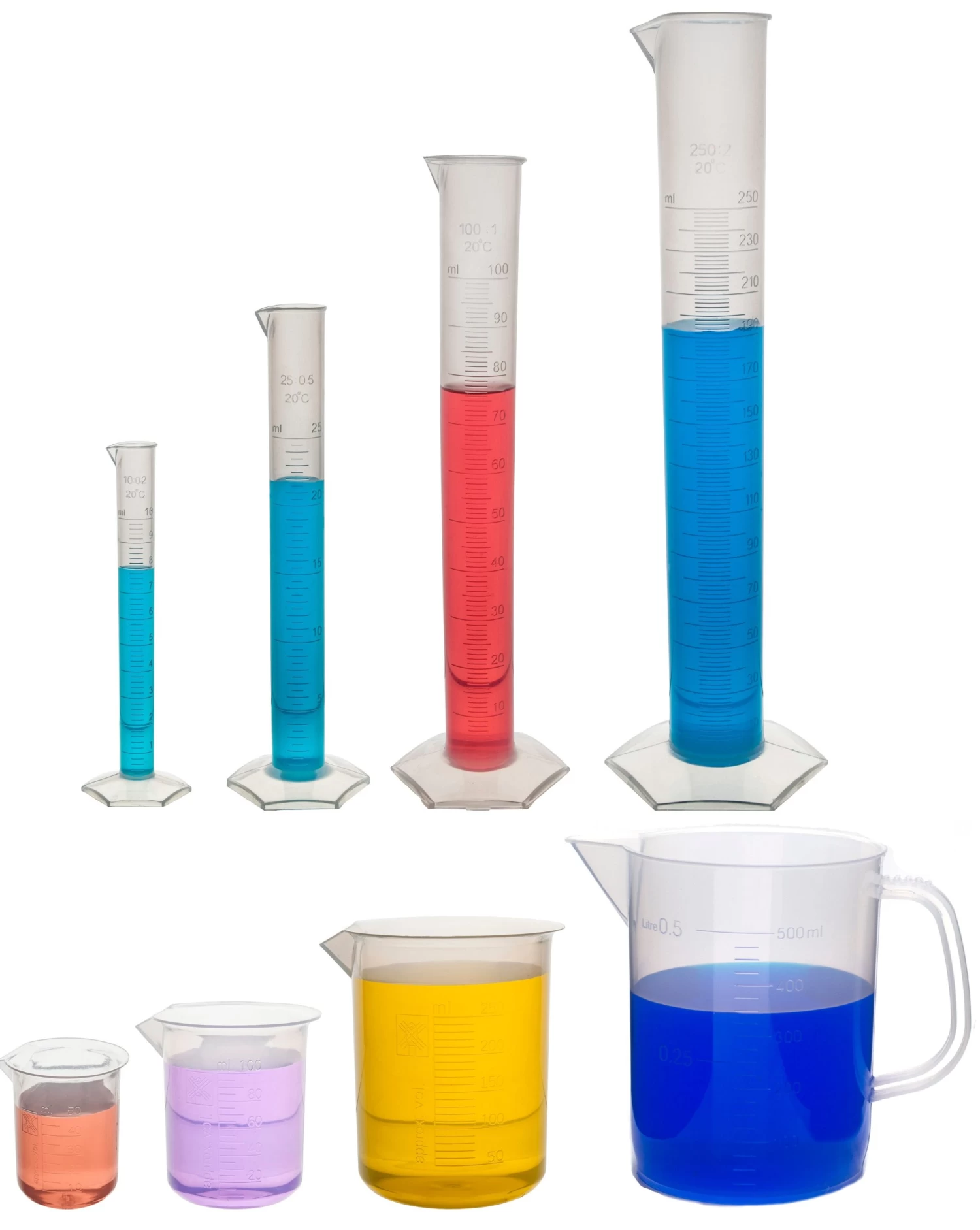 - 8 PIECEÂ || 8 piece short form beaker, pitcher and measuring cylinder set with graduations – Beaker sizes: 50mL, 100mL, 250mL – Graduated cylinder sizes: 10mL, 25mL. 100mL, 250mL – Pitcher size: 500mL