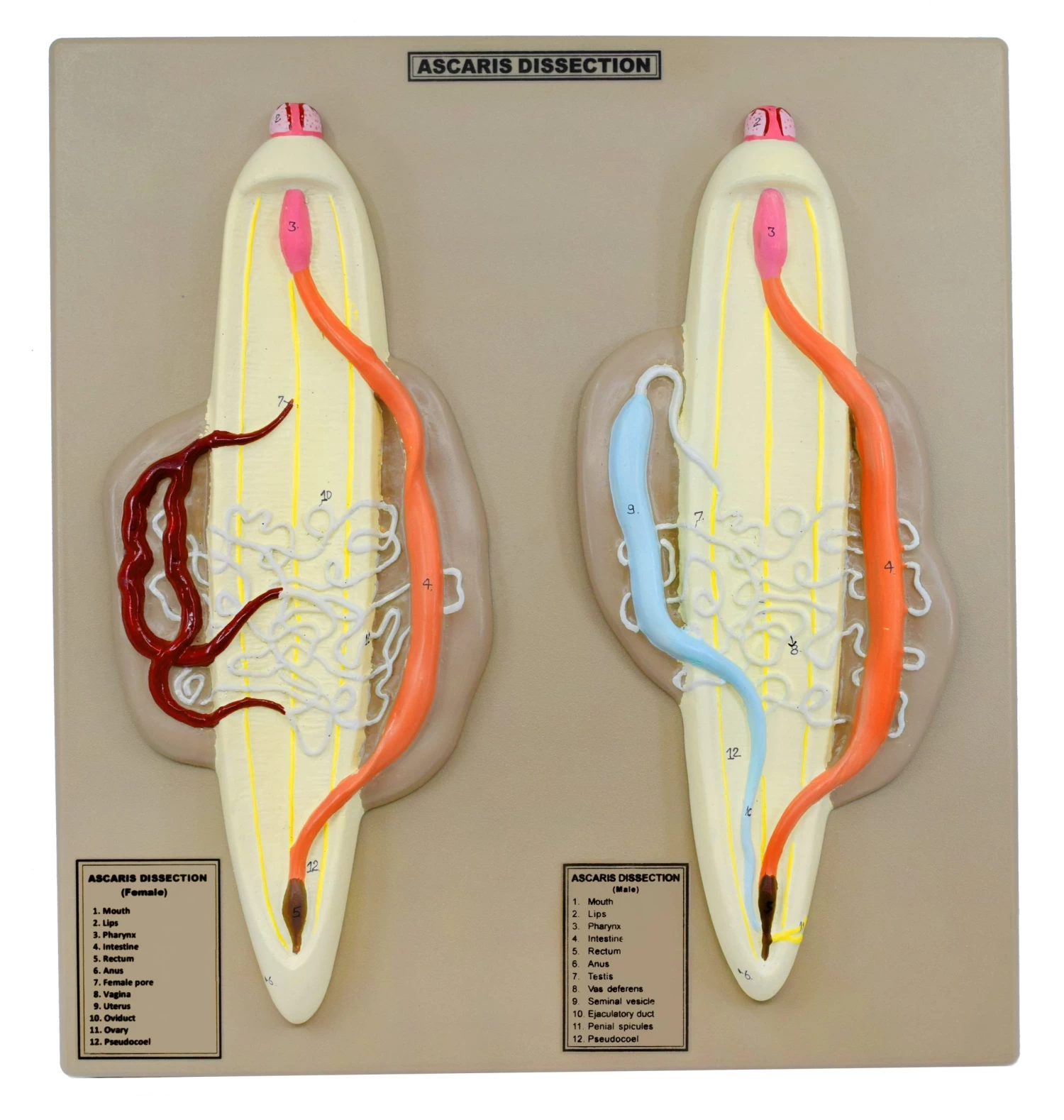 Ascaris model is used for biological study, and depicts the internal organs and structures for detailed examination. The model is mounted on a base for display, and is made of durable polyvinyl chloride (PVC) plastic, which is corrosion resistant, lightweight, and has high strength, resisting reactions with acids, gasoline, alcohol, and hydrocarbons.