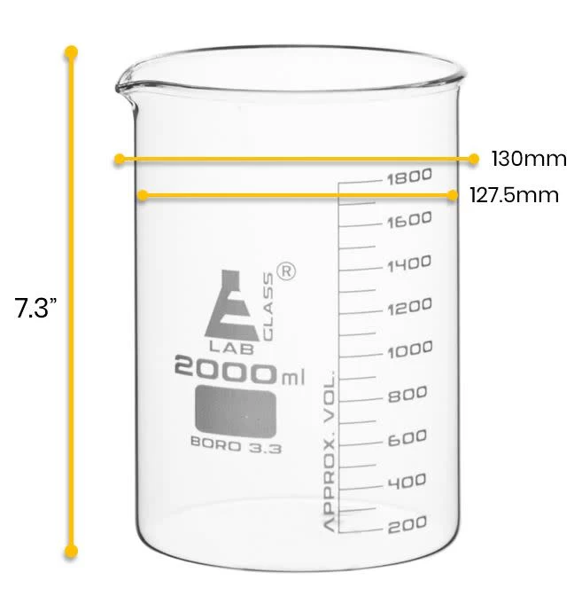 2000ml capacity, low form beaker made of Borosilicate 3.3 Glass. Beaker features white graduation lines, marked every 100ml, as per DIN 12231. Spout for easy pouring. Uniform walls provide excellent strength against breakage.