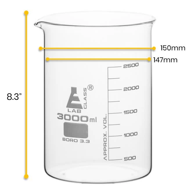 3000ml capacity, low form beaker made of Borosilicate 3.3 Glass. Beaker features white graduation lines, marked every 250ml, as per DIN 12231. Spout for easy pouring. Uniform walls provide excellent strength against breakage.
