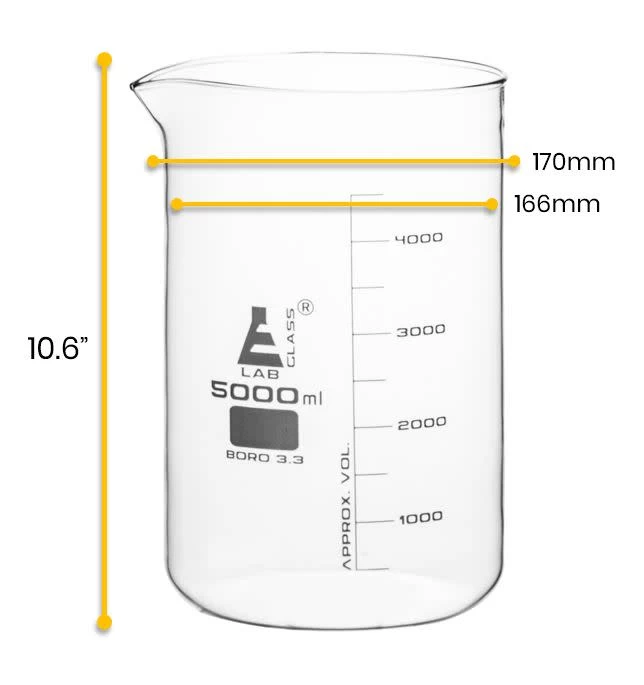 5000ml capacity, low form beaker made of Borosilicate 3.3 Glass. Beaker features white graduation lines, marked every 500ml, as per DIN 12231. Spout for easy pouring. Uniform walls provide excellent strength against breakage.