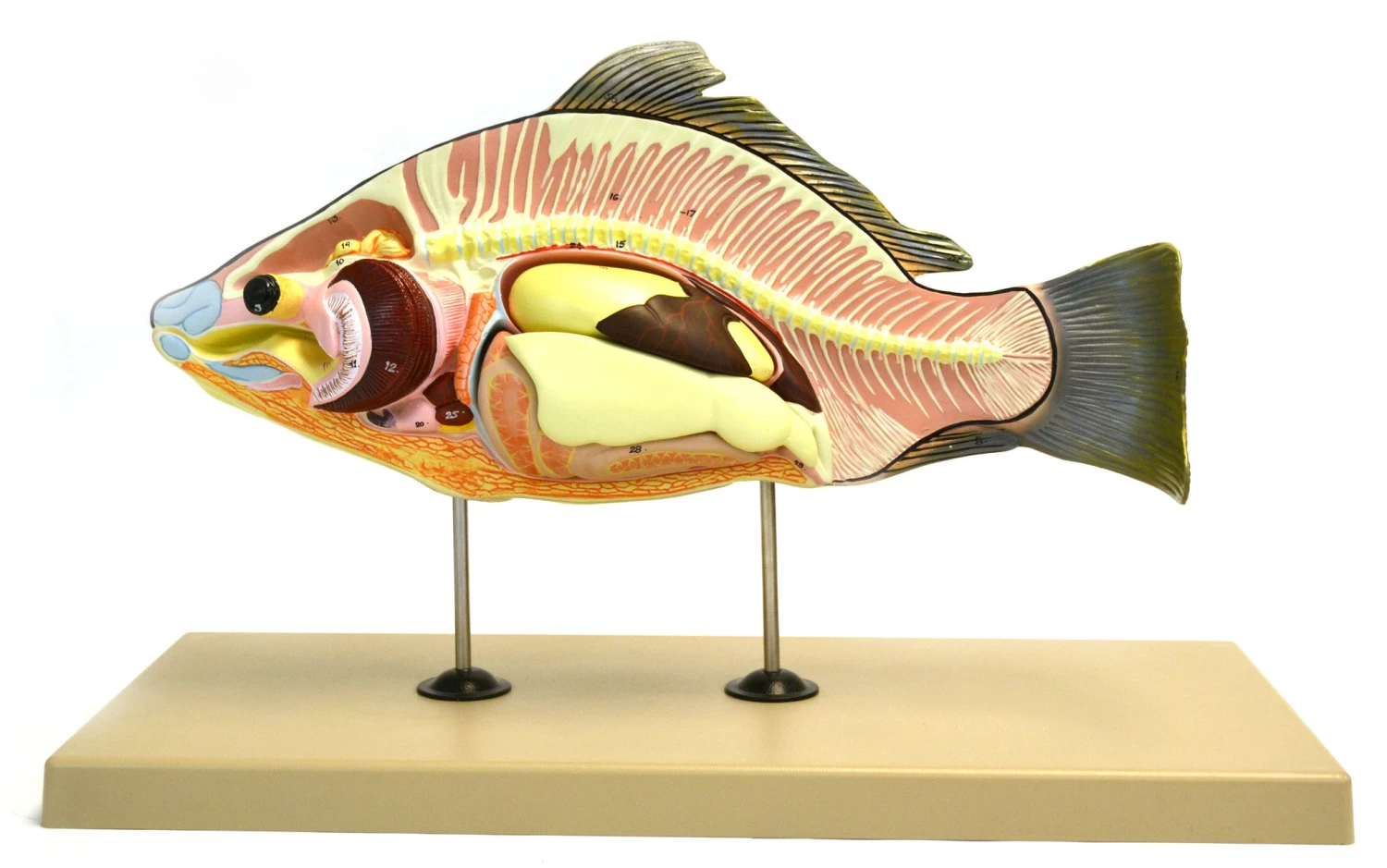 Typical boney fish model, this carp is natural size. One side shows the form, coloring , and external features, other side shows skeleton and internal organs. Intestine, stomach, and air bladder are removable. Includes key card calling out 30 structures. 16 inches long, includes sturdy base.