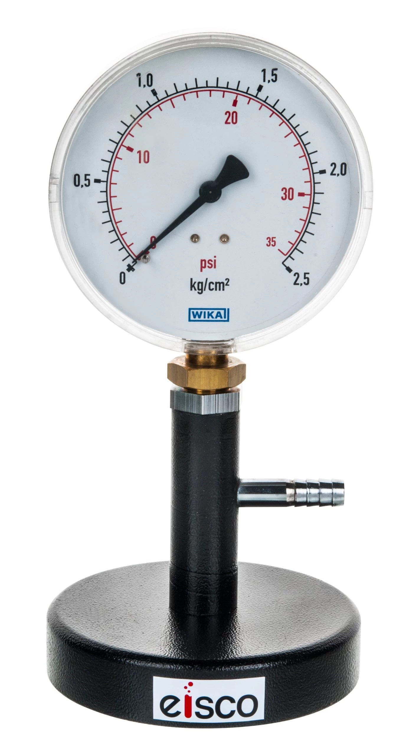 The Bourdon gauge is a safe and simple tool for measuring the pressure of various gases and liquids. The stand has a nipple with which to connect a gas or liquid source hose and its easy to read gauge makes it very user-friendly.
