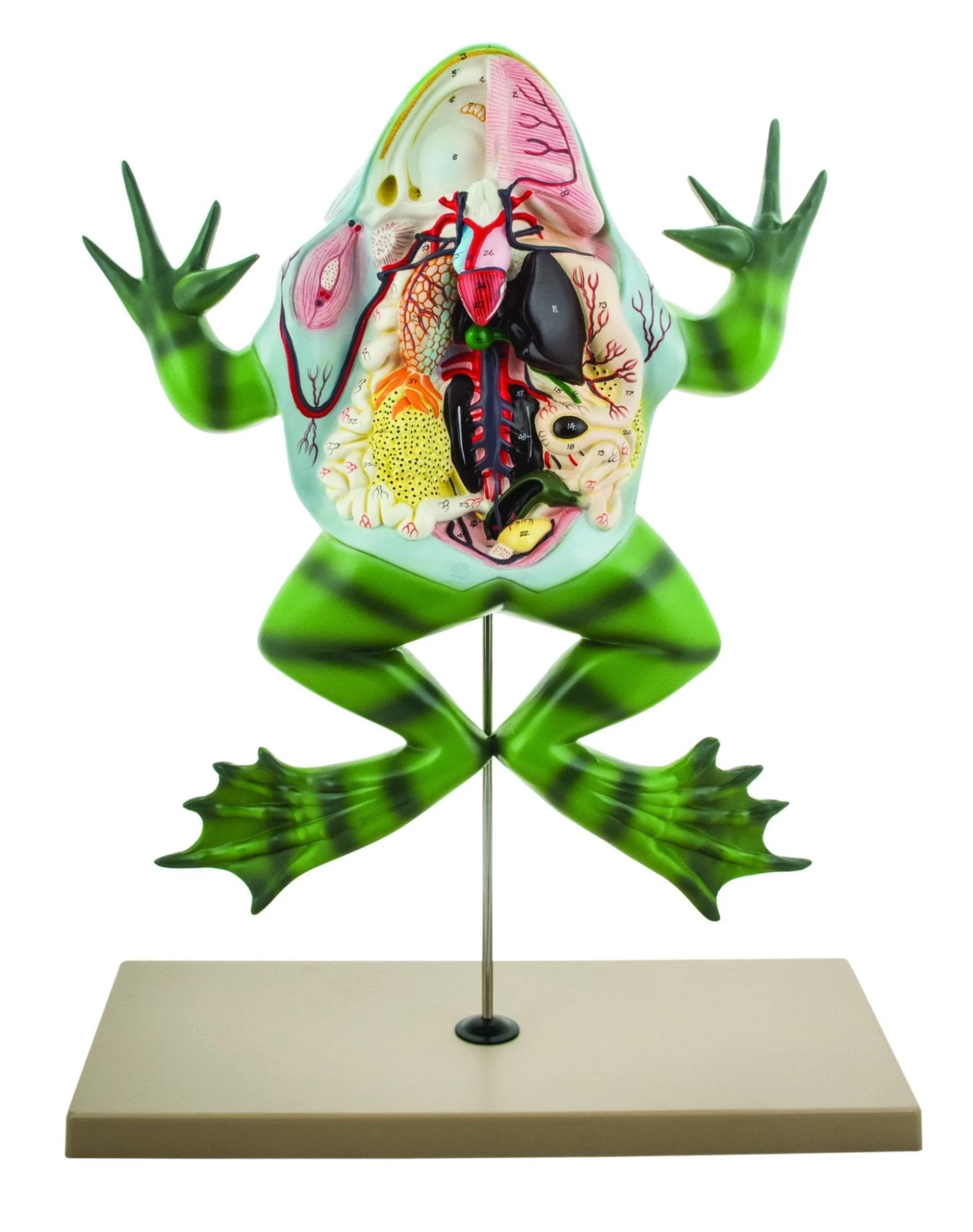 The detailed 3D rendering of a frog dissection with its vibrantly colored anatomy is ideal for studying the structure and function of the basic organs in a frog. Key anatomical parts are colored and numbered for comparison with the anatomy key that is included – all major organs are clearly visible and labeled on the ventral side. The frog itself can also be removed for further manipulation and investigation. This model provides a visually and kinesthetically effective method for studying the structure and function of the anatomy of a frog. It is a particularly useful tool for students who struggle with dissection to understand the basic anatomy that is gleaned from doing a dissection.