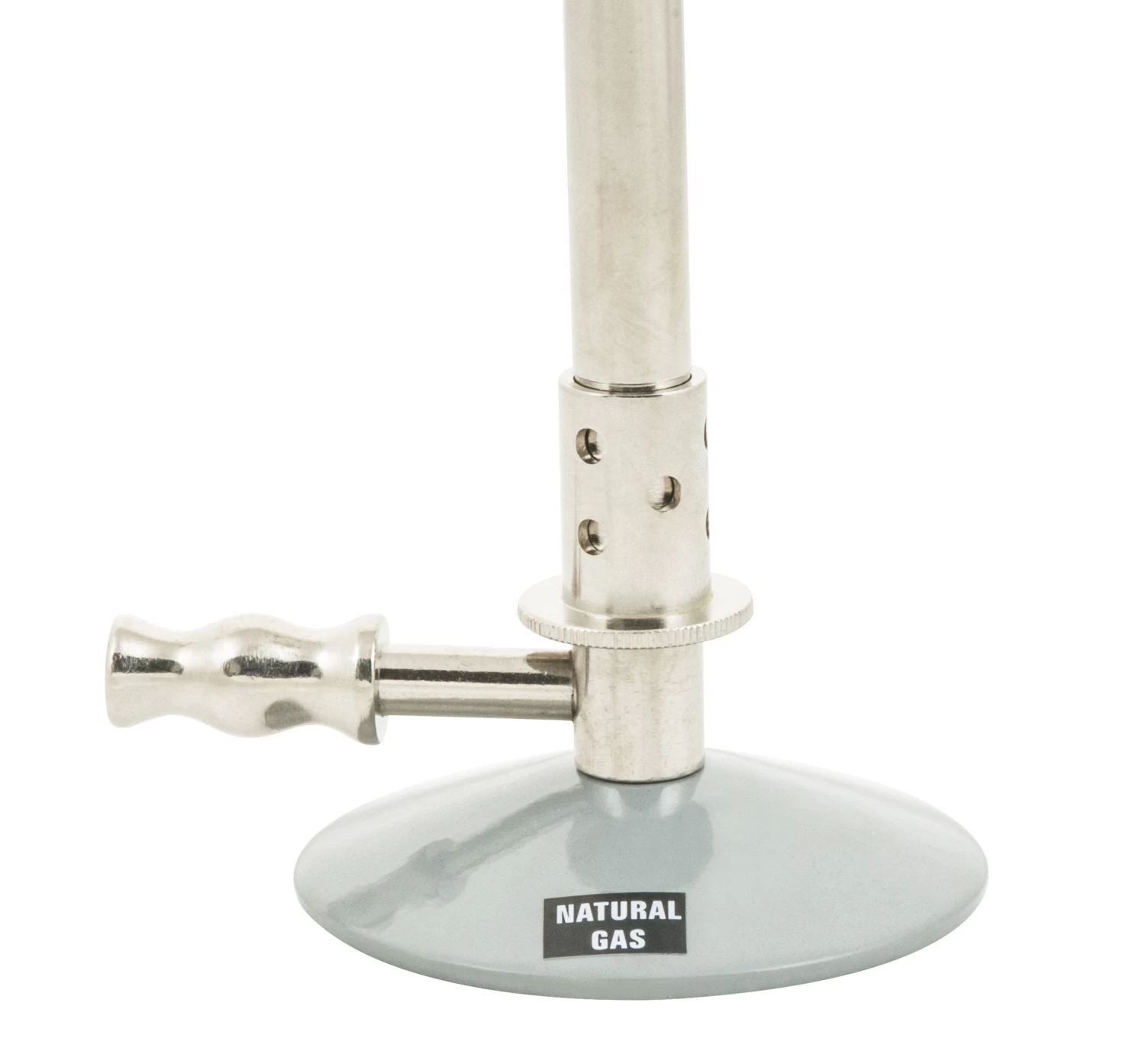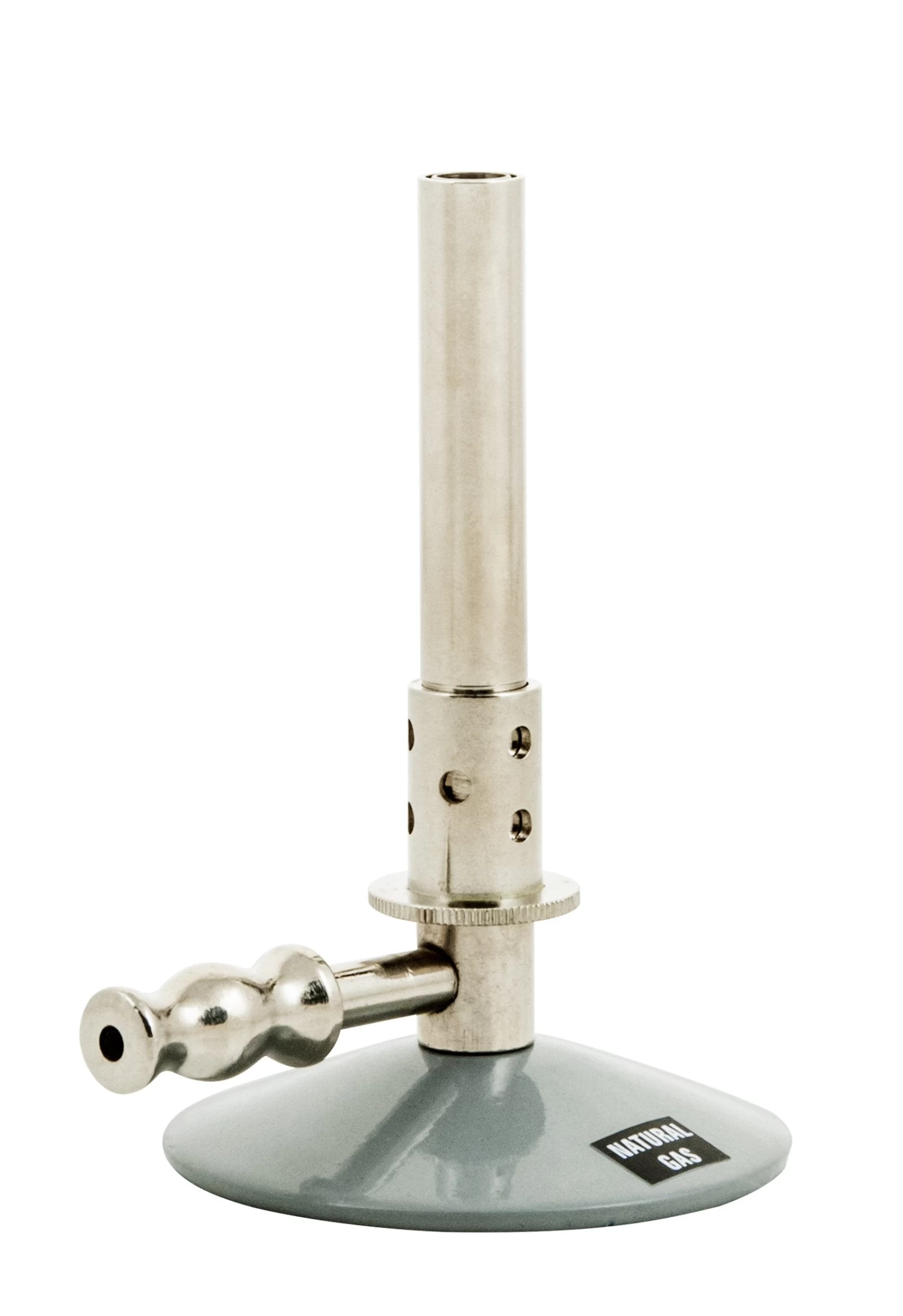 Nickel plated burner tube with regulated air regulator and connector. Mounted on steel base, Base dia. 70 mm to be used with natural gas.