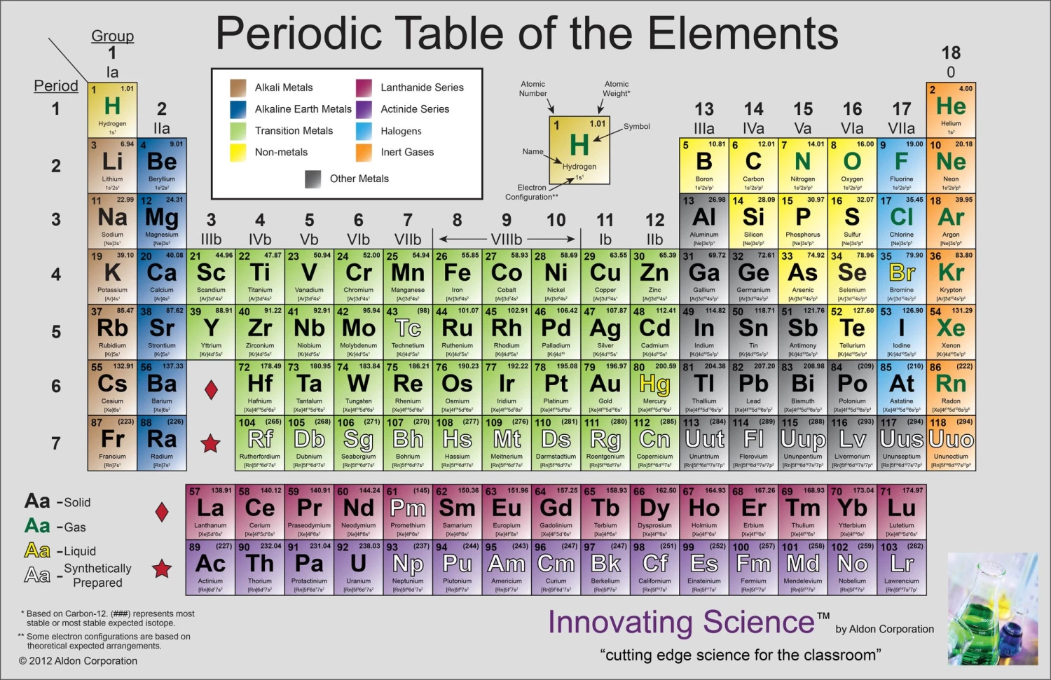 - Colored-coded for distinguishing between metals, non-metals, and noble gas families, and differentiating types of metals, solids, liquids, and gases from synthetic elements