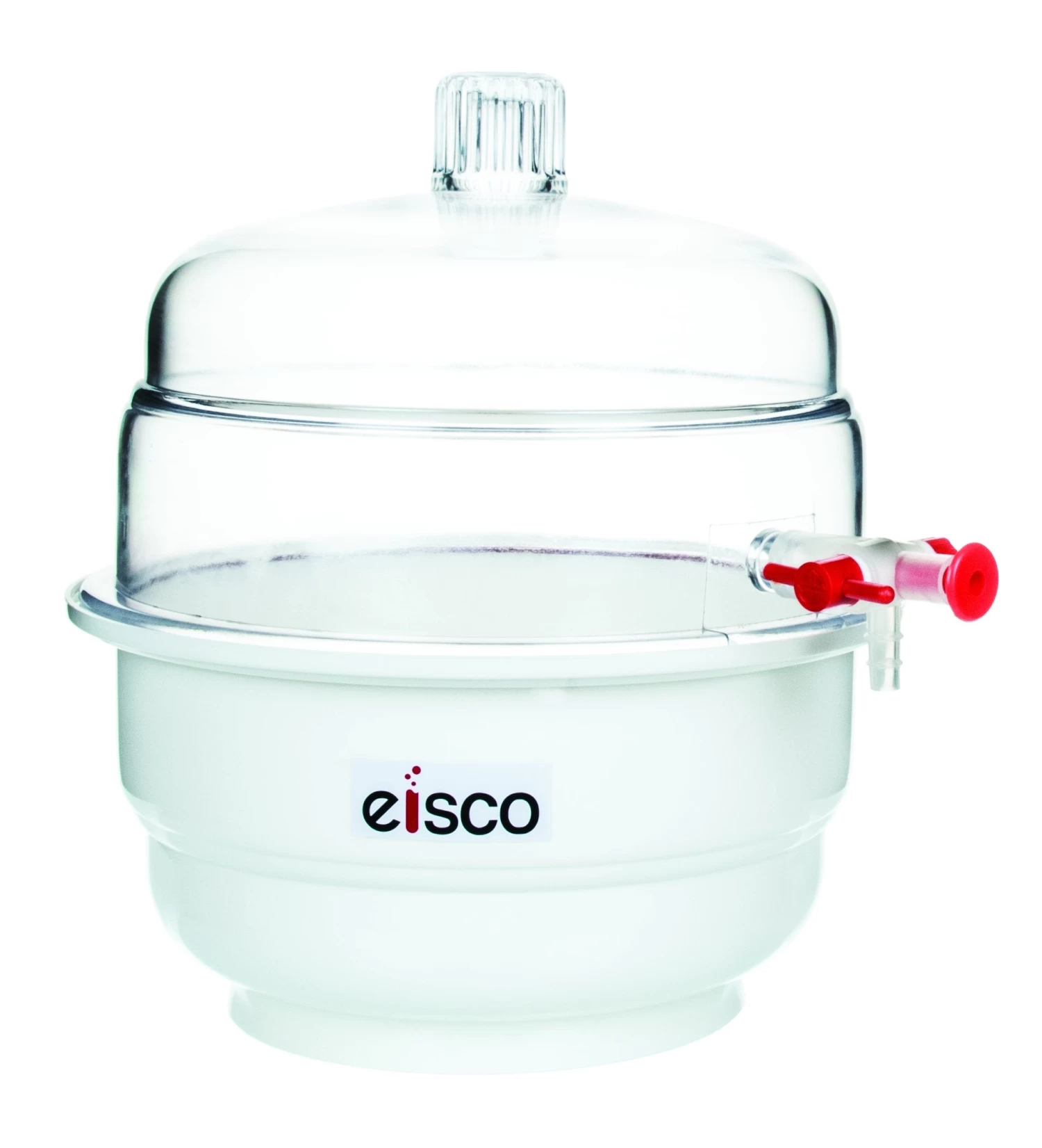 Made of polypropylene and polycarbonate. Autoclavable, desicators can hold vacuum upto 740 mm of Hg for 24 hrs. An internal groove is provided on the flange to hold a silicon rubber O-ring.