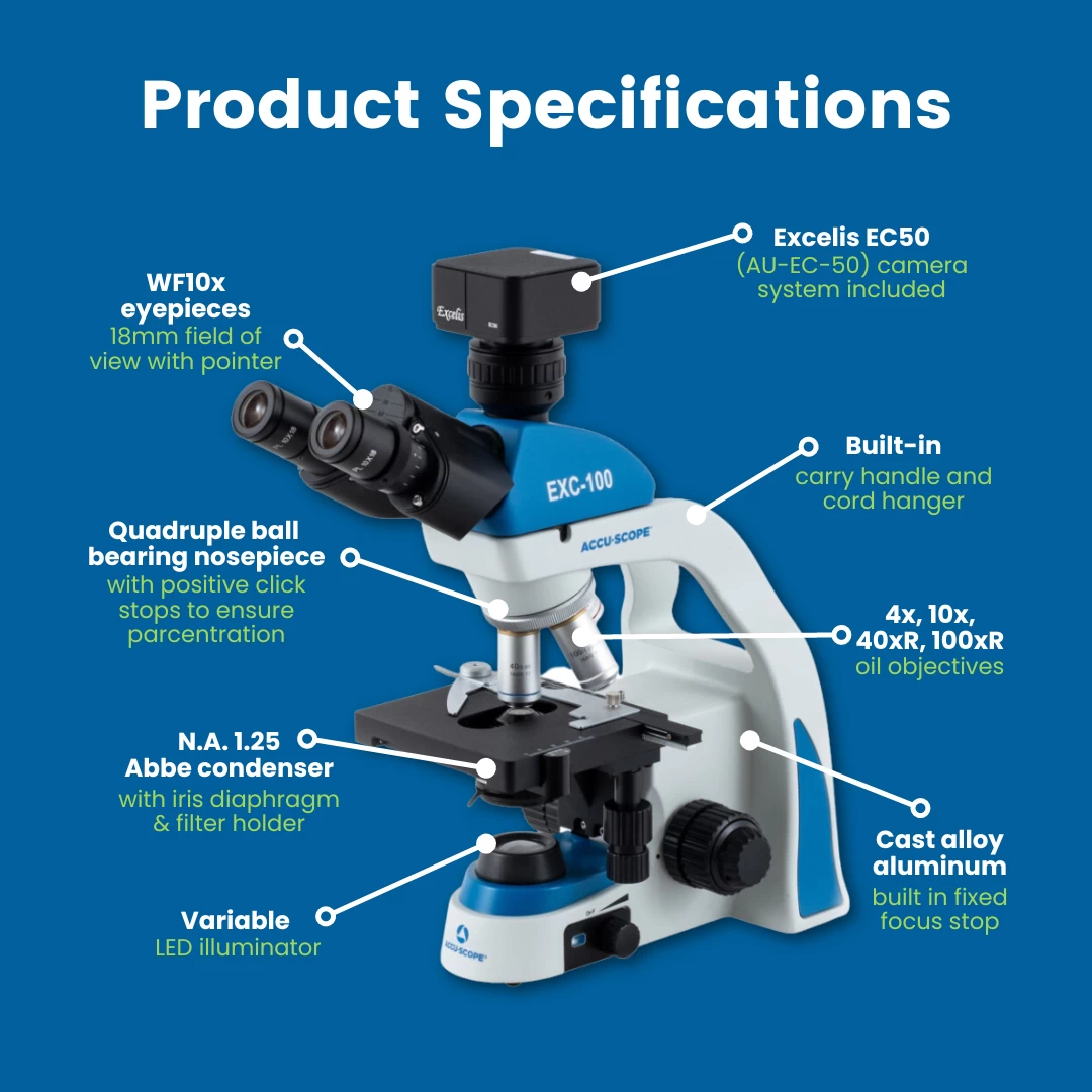 - GREAT IMAGES || Ideally suited for the classroom environment, the EXC-103-EC50 Microscope provides clear images during observation, with front lens surfaces that are flush and easy to clean. The achromat 4x, 10x, 40xR*, and 100xR* oil immersion DIN objectives provide 40X-1000X magnification. Variable LED control with Abbe condenser and iris diaphragm delivers bright, even illumination for excellent image contrast