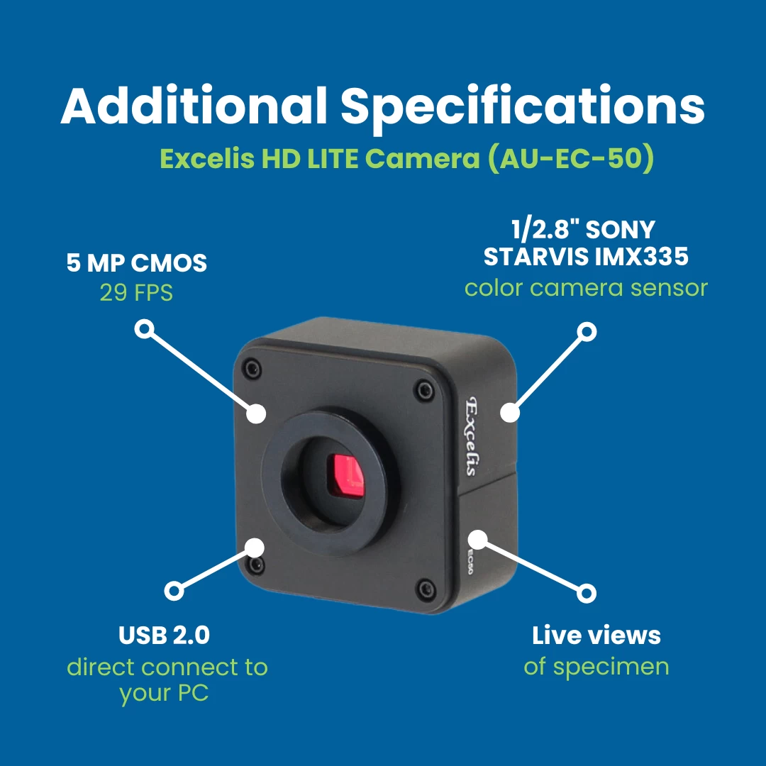 The Included Excelis EC50 Color Microscopy Camera provides excellent image quality for routine microscopy imaging applications. A Sony STARVIS CMOS sensor is at the core of the EC50 and features a rolling shutter for high resolution and great color at high frame rates. Data transfer across a USB 2.0 cable ensures stunning live views of the specimen. CaptaVision+ software brings excellent camera controls and new dimensions to imaging including real-time intelligent flatfield correction, dynamic measurements, automatic counting, and much more.