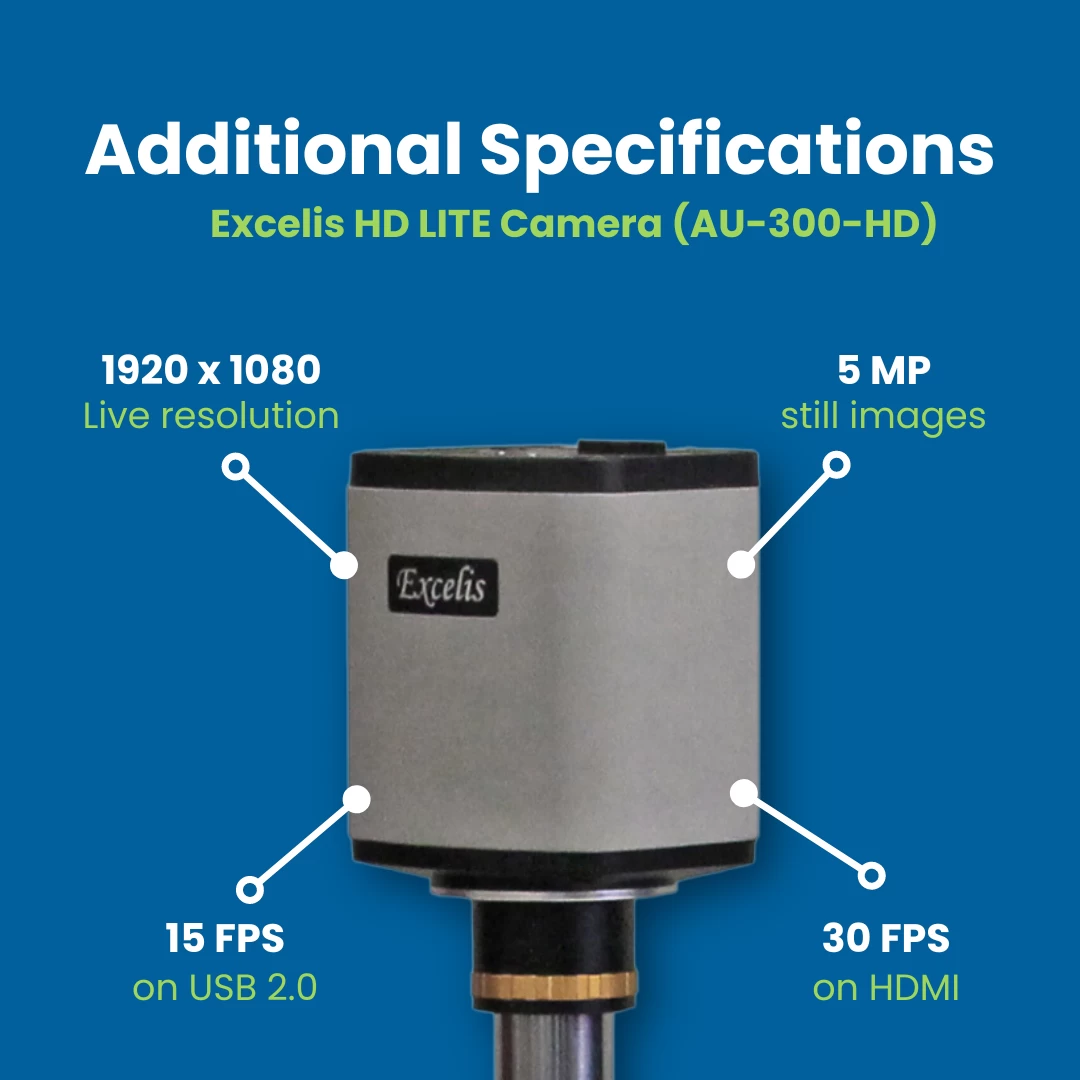 – Camera: Includes Excelisâ„¢ HD LITE (AU-300-HD) HD camera system and 0.5x c-mount adapter. Sensor: 1/2.5″ Aptina MT9P031 color CMOS, 2.2µm pixels. Live Resolution: 1920 x 1080. Capture Resolution: 5MP (2592 x 1944). Frame Rate: HDMI: 30fps / USB2.0: 15fps. Image Capture: Hi Speed SD Card (8GB). Video Capture: HDMI: 1080p, 15fps to SD Card / USB2.0: 1080p, 15fps to PC. Advanced Camera Controls: Still image measurement and annotation, flatfield correction; extended depth of focus (focus stacking); image stitching; HDR (High Dynamic Range) function. Output Mode: HDMI or USB 2.0. Power Supply: DC 12V/1A. PC Imaging Software: CaptaVision Imaging Software (for PC only; Mac OS not supported)