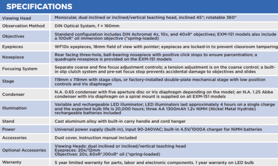Easy to use and student friendly, the Accu-Scope EXM-150-EP microscope features a monocular head with disc diaphragm LED. Highly portable with a built-in carry handle, cord wrap, and rechargeable LED illumination. Separate coarse and fine focus adjustment controls with tension adjustment on the coarse control. A built-in slip clutch system and pre-set focus stop prevents accidental damage to objectives and slides. Includes DIN achromat 4x, 10x and 40xR* objectives (* spring loaded).