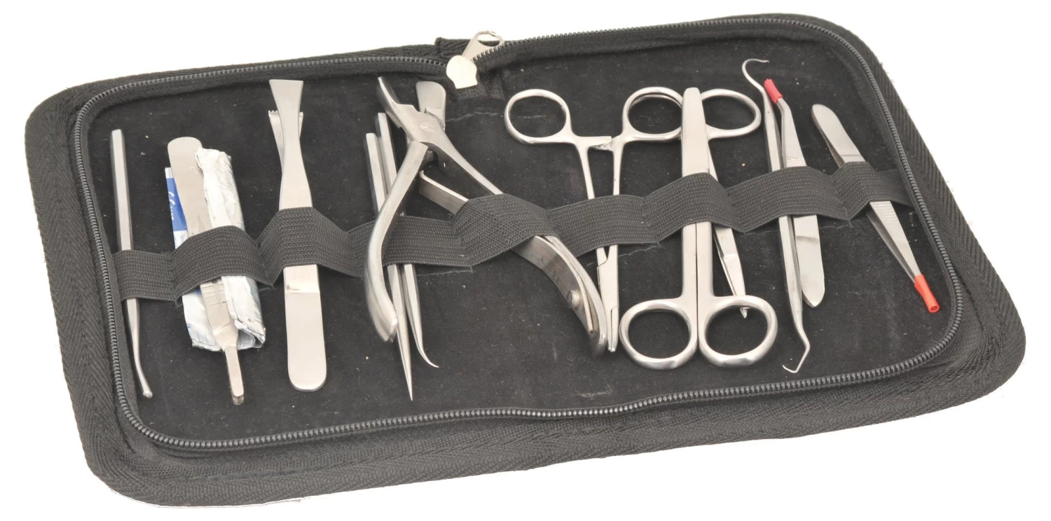 - 12 PIECE SET || Includes: 2 scissors (4″ fine point, 5″ blunt end), 2 forceps (4″ fine point, 5″ blunt end), 1 straight needle, 1 curved needle, 1 straight artery forceps, 1 tissue forceps, 1 seeker, 1 scalpel handle #4, 1 scalpel blade #20, 1 bone cutter (4.5″), 1 dental probe with seeker (6″)