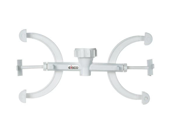 Eisco’s polypropylene double burette clamps come with easy-to-change wedges that hold rods of 10mm or 12.5mm diameter. Rugged yet lightweight, they are equipped with a spring-loaded jack that locks firmly onto burettes to prevent slip. Non-metal build reduces the chance for accidental impact breaks of glass burettes.