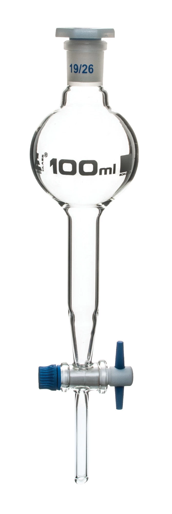 100ml capacity, Gilson style separating funnel made of high quality borosilicate glass. Features a PTFE key stopcock and a 19/26 size socket with an interchangeable plastic stopper.