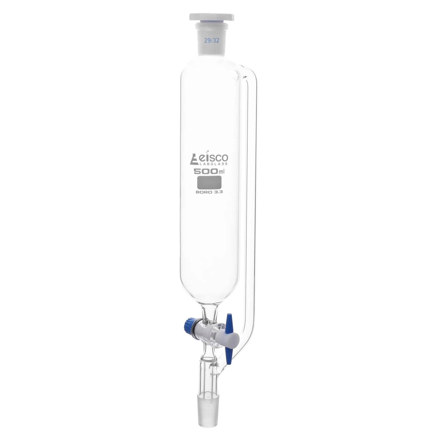 500mL cylindrical glass Dropping Funnel/Separatory Funnel. Made of high quality borosilicate 3.3 glass with superior durability, heat tolerance, and chemical resistance. Transparency allows for high visibility. Used to transfer liquids. Using the stopcock allows fluids, including reagents, to dispense slowly (drop-wise). Fitted with an interchangeable 29/32 plastic stopper and PTFE Key Stopcock.