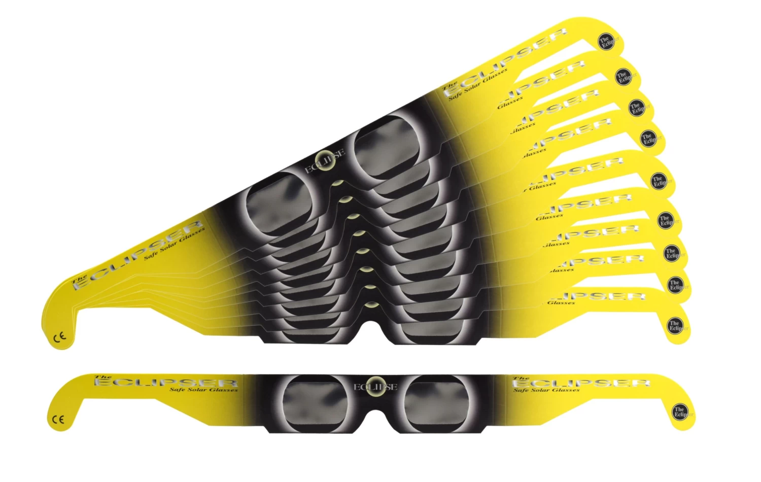 Eclipser Solar Eclipse Glasses are independently tested and compliant with CE & ISO 12312-2 standards. They feature 2 mil scratch-resistant polymer lenses with an optical density of 5 or greater, that filter out 100% of harmful UV and infrared rays and 99.999% of intense visible light. The backside of the glasses are pre-printed with essential instructions and warnings to ensure your safety during the event.