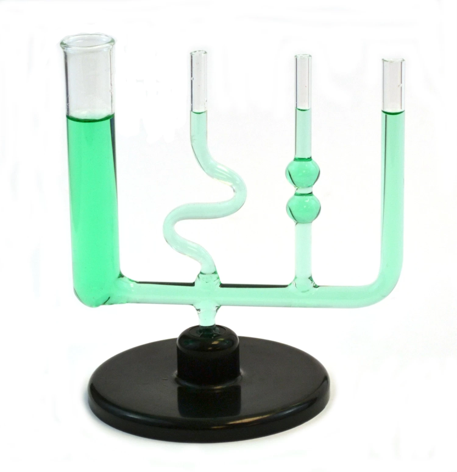 - A set of 4 borosilicate glass tubes of different shapes to illustrate that liquids will maintain the same level, regardless of shape