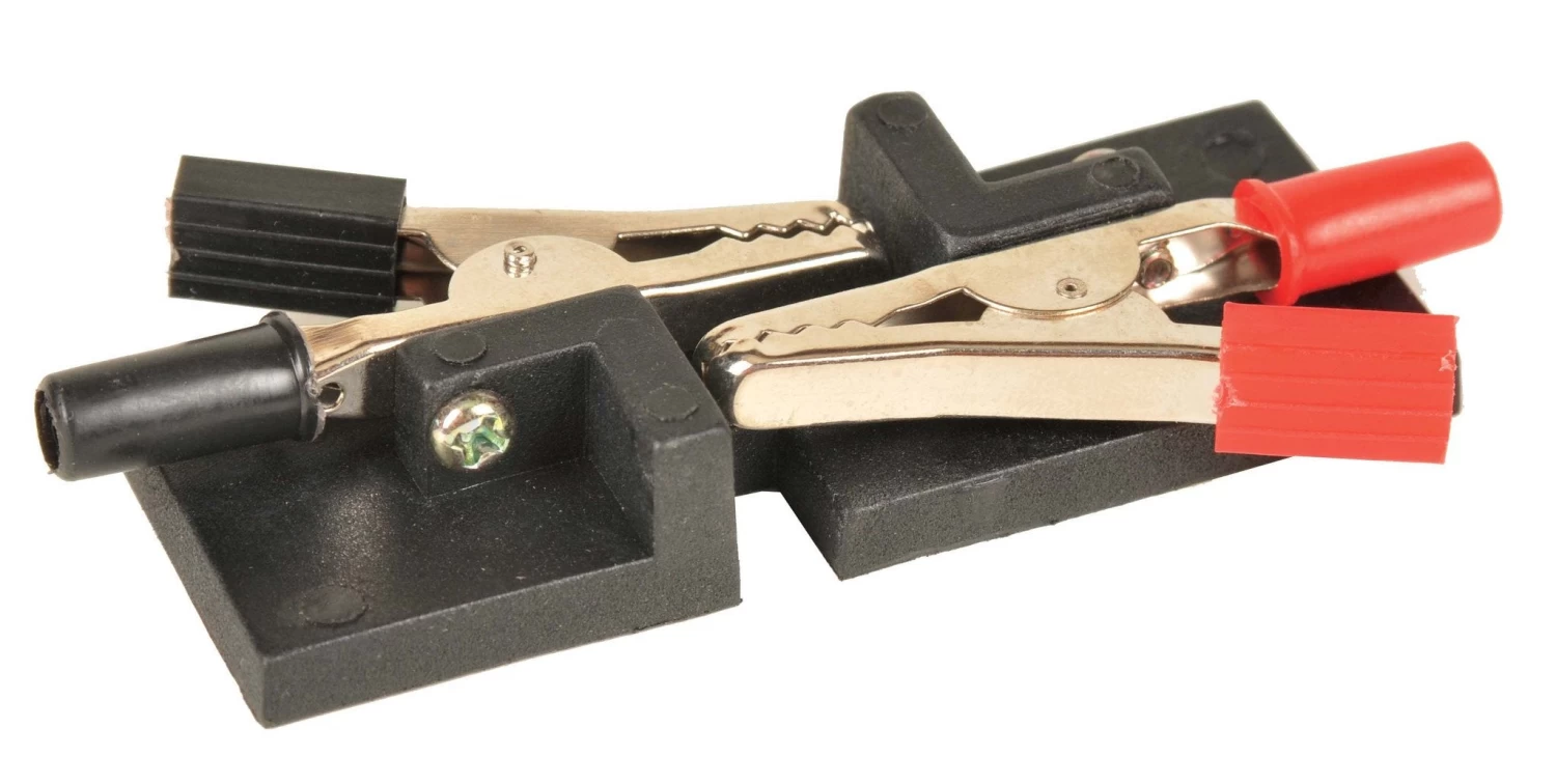 Plastic Strip of size 78 x 27 x 5 mm fitted with two crocodile clips to take rod or foil electrodes. Each crocodile clip has a 4 mm socket for lead connection. Without electrodes.