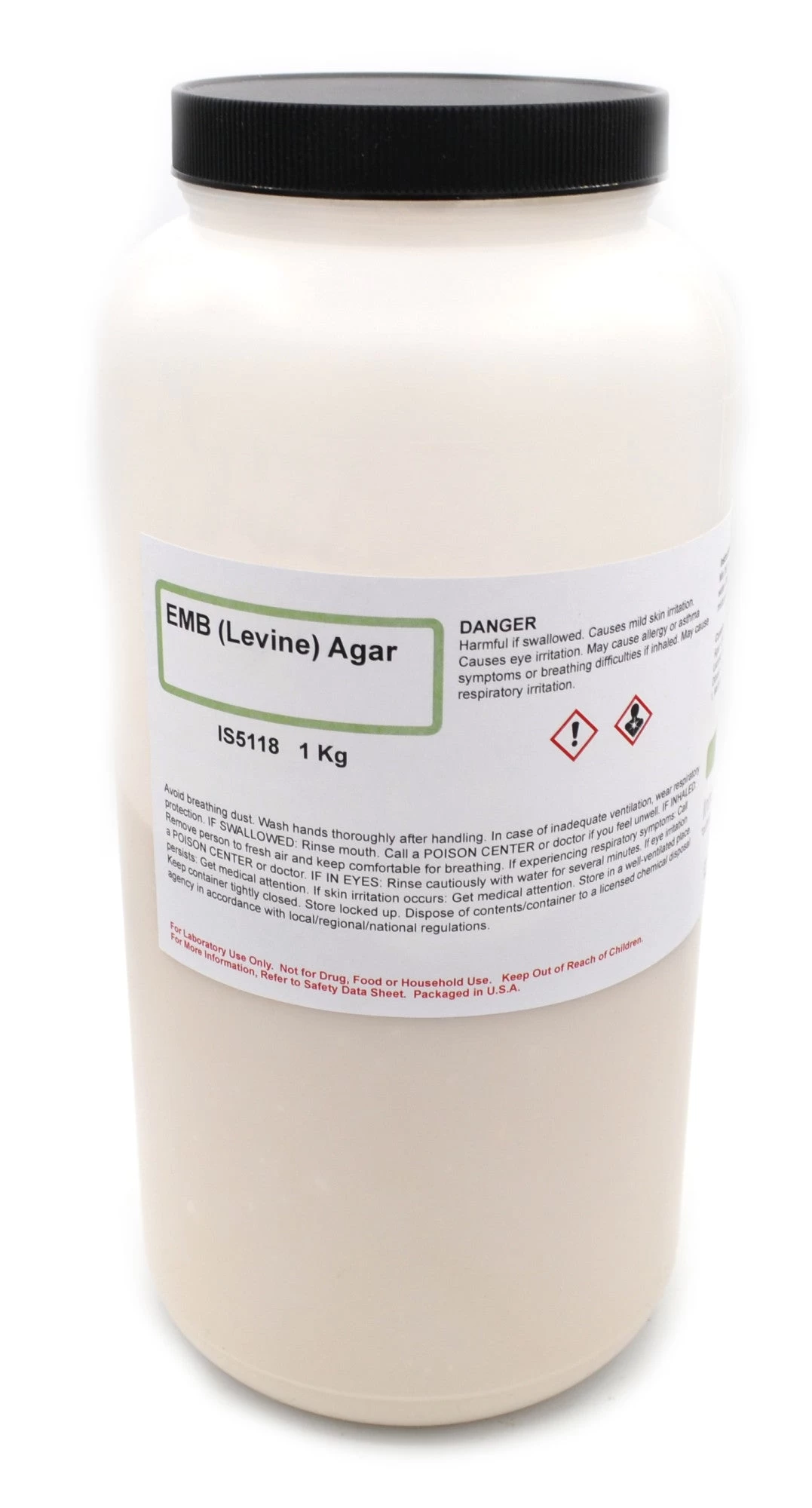 1000 grams of EMB (Levine) agar, used to select for gram-negative bacteria and differentiate between lactose-fermenting and non-fermenting species. Agar comes dehydrated in a plastic open-mouth bottle for convenient storage. Each bottle makes 27 L of growth medium. Each bottle comes with an SDS, providing safe handling and storage information.