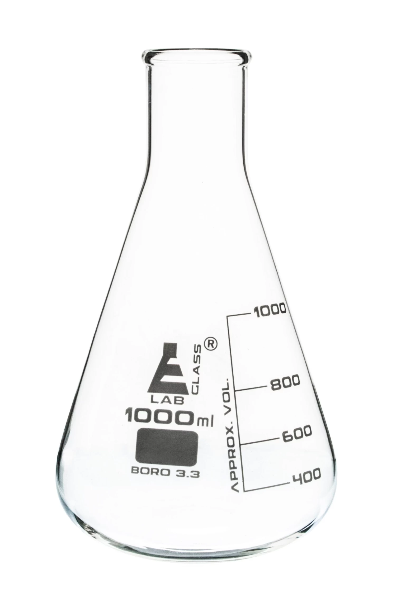 Erlenmeyer Flask with a 1000mL capacity and narrow neck is made of heavy-duty borosilicate 3.3 glass.Features white enamal graduations every 200mL, a uniform wall thickness ideal for heating, and a reinforced rim to protect against accidental impacts. Meets DIN ISO 1773 standards for conical flasks.
